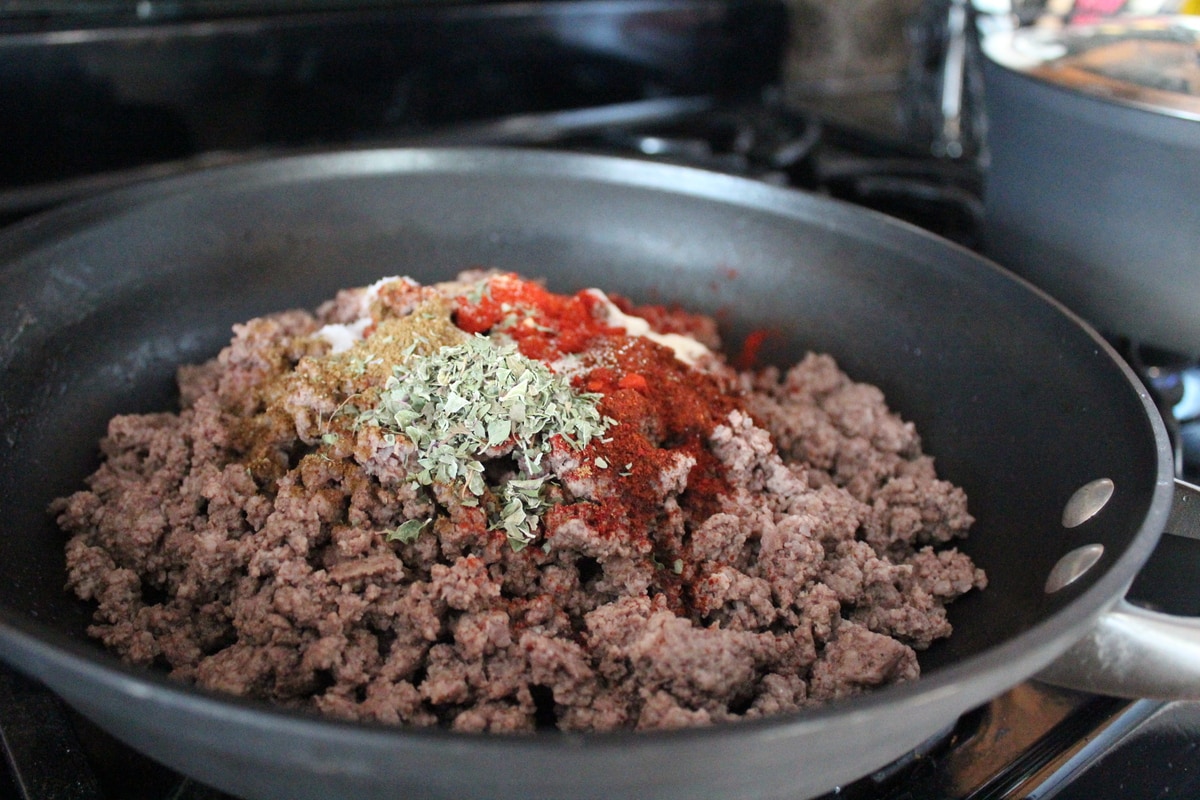 - Add the chili powder, paprika, cumin, oregano, onion powder, garlic powder and salt.