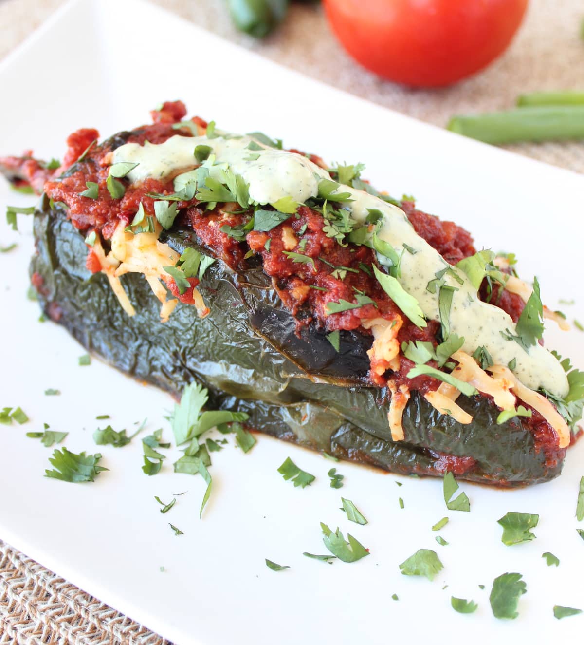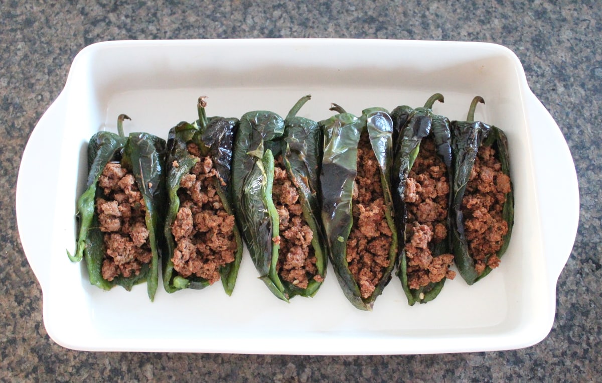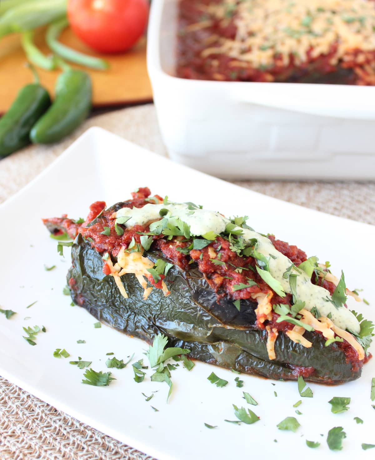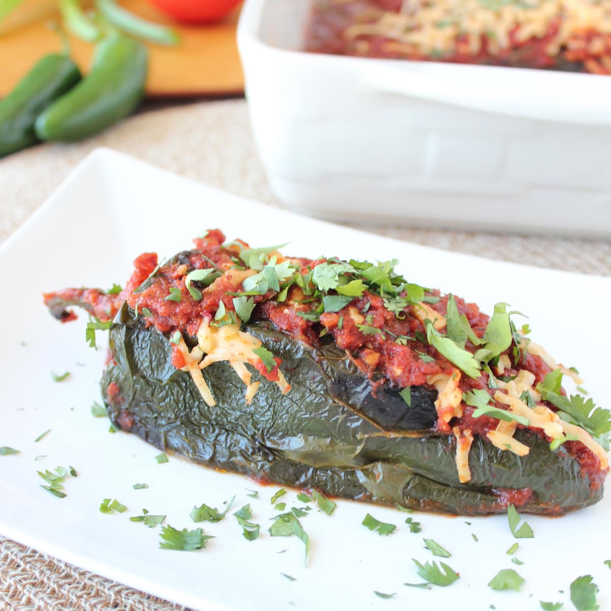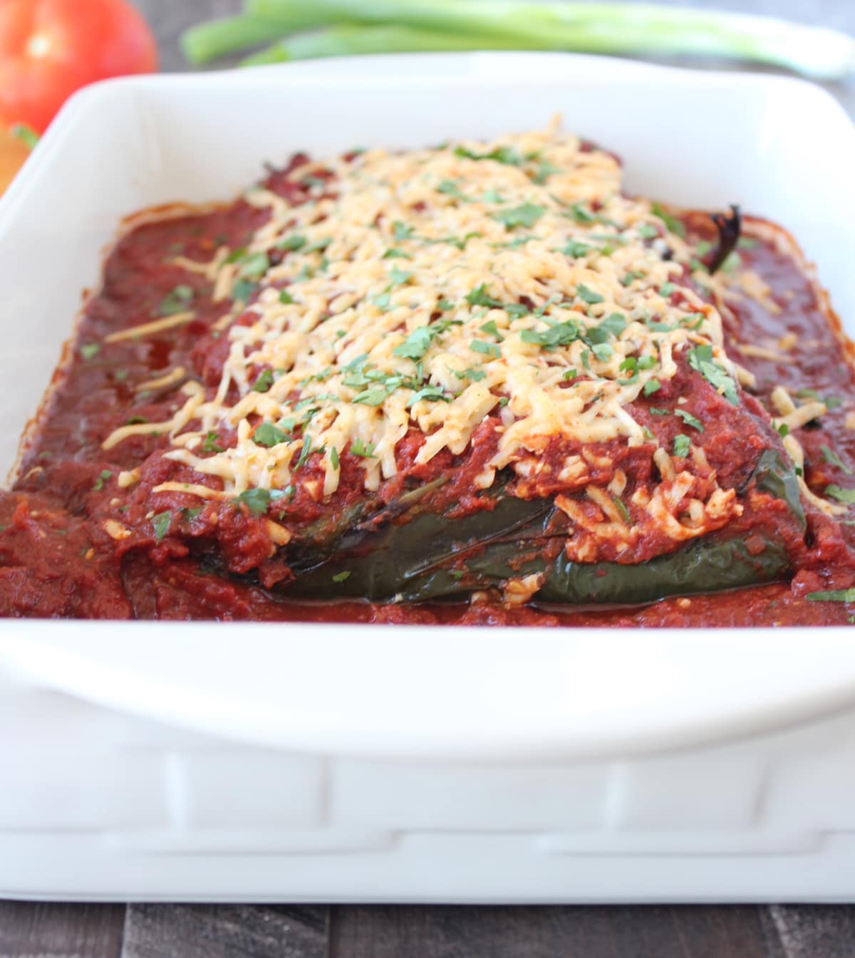Instead of tortillas, these gluten free enchiladas are made with enchilada spiced ground beef stuffed in roasted poblano peppers & covered in the most delicious homemade red enchilada sauce!
