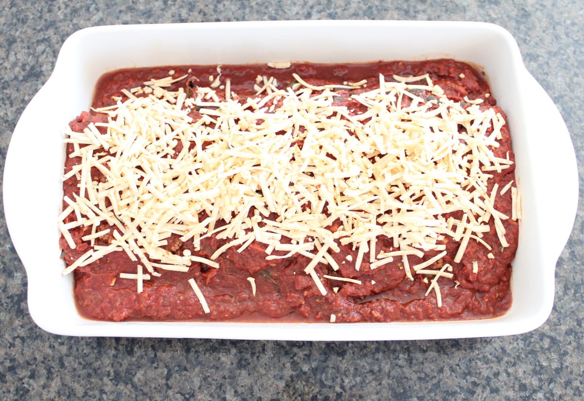 Pour the enchilada sauce over the stuffed peppers then sprinkle the cheese over the top.