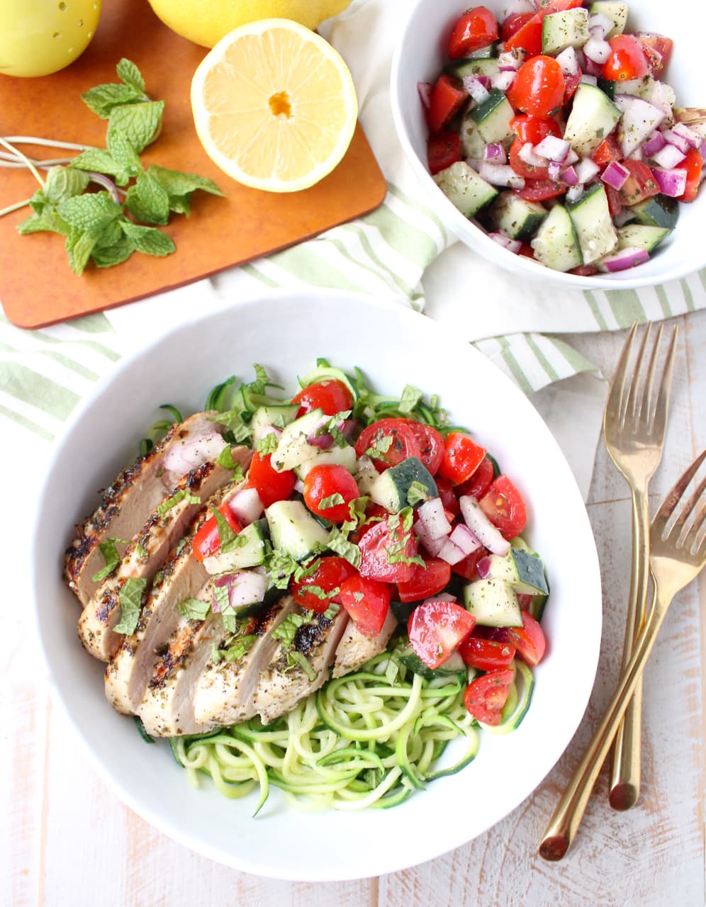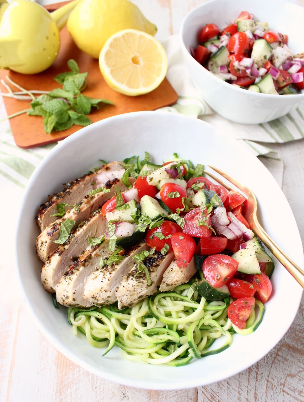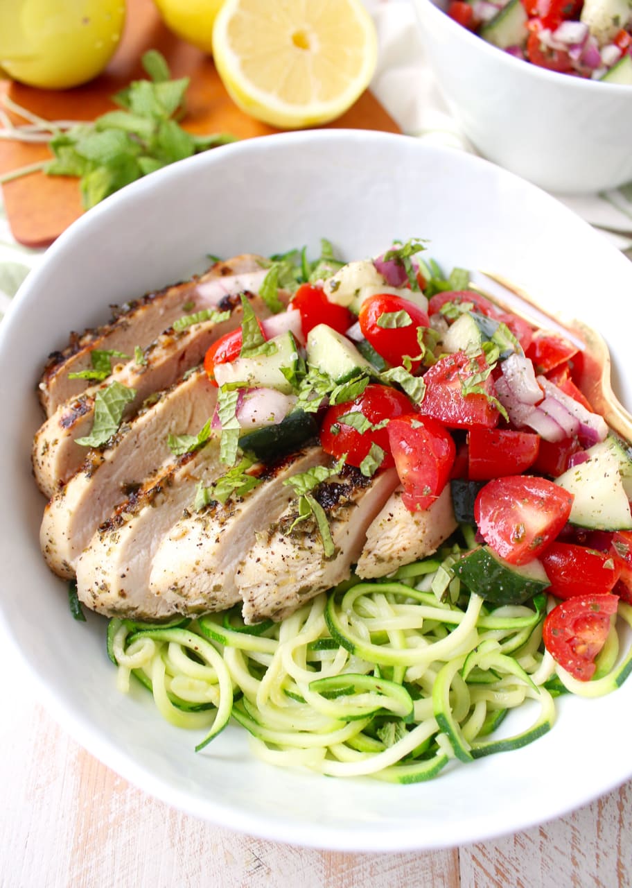 Spoon the tomato cucumber salad over the greek chicken and zoodles. Optionally sprinkle feta cheese and fresh mint over the bowls. Serve each bowl with a lemon wedge to squeeze over the bowl.