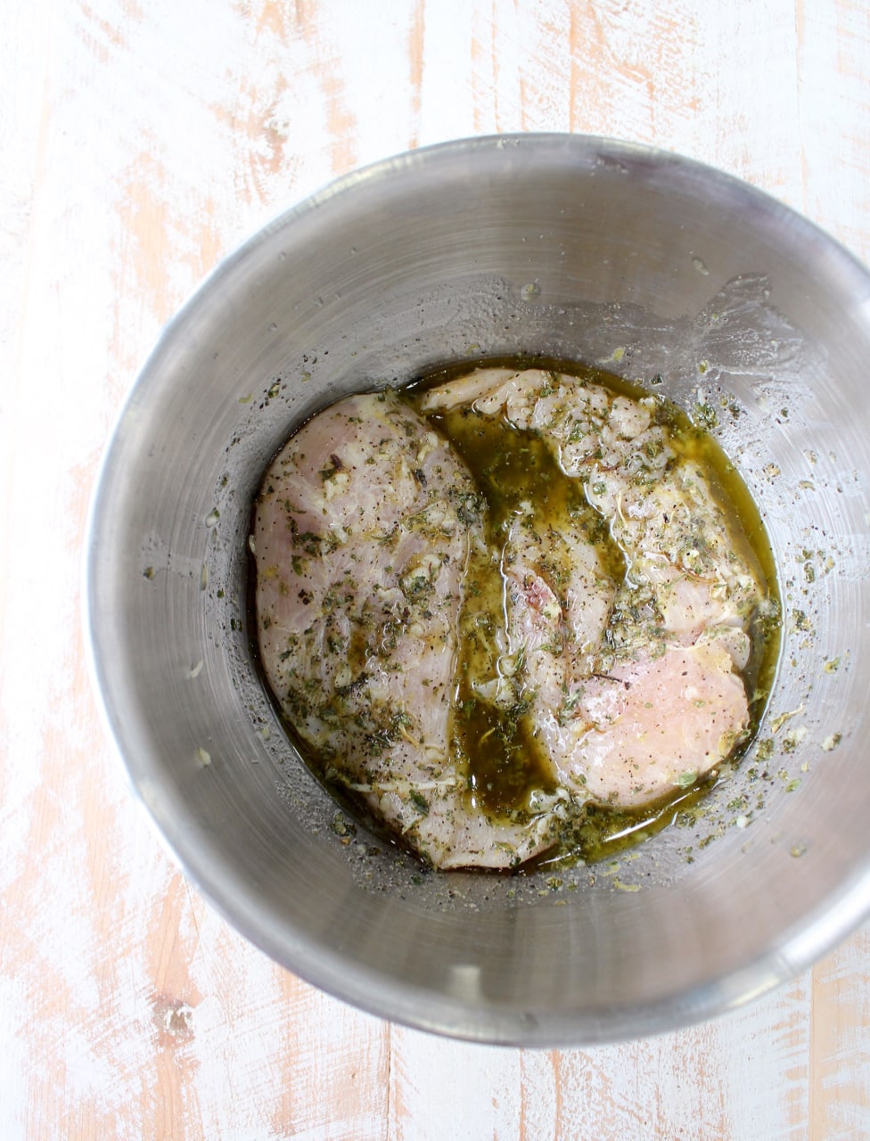 - In a large bowl, prepare the marinade for the chicken by combining the olive oil, crushed garlic, dried oregano, lemon zest, lemon juice, parsley, kosher salt & black pepper.