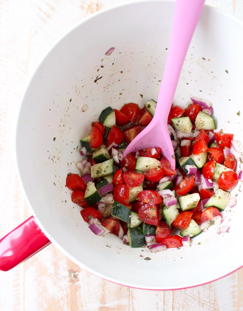 - Pour this mixture over the diced tomato, cucumber and onion, toss to combine.