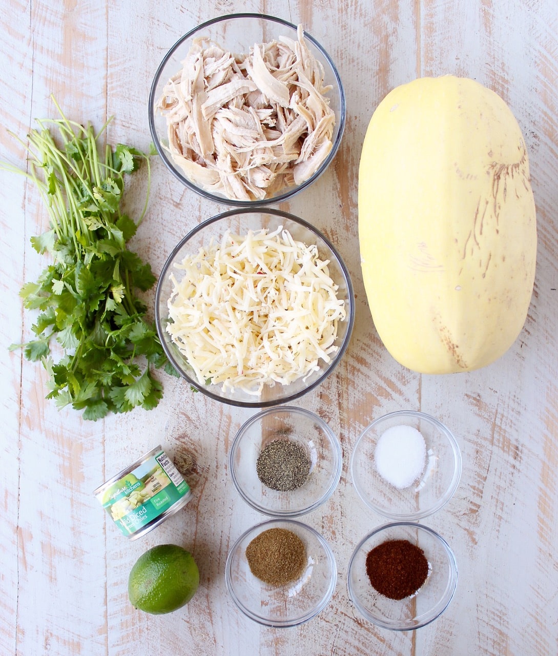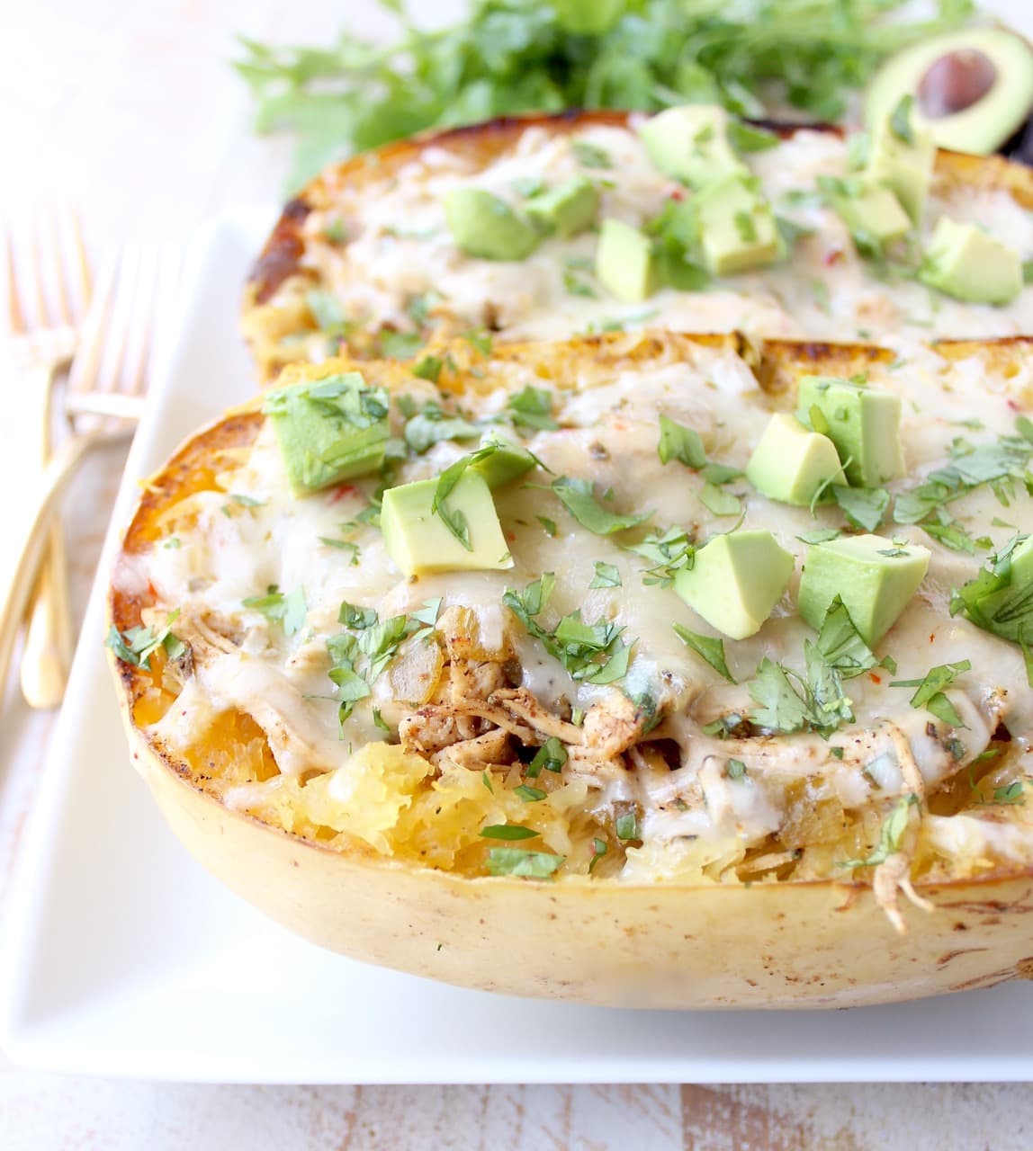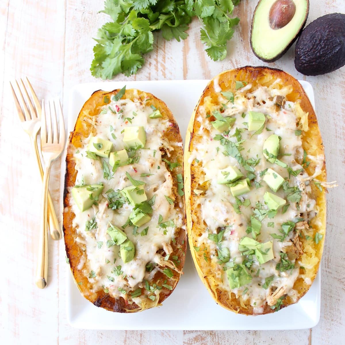 This green chili chicken spaghetti squash recipe was inspired by one of my favorite soups, Green Chili Chicken Enchilada Soup.