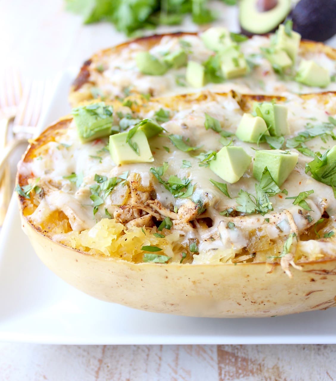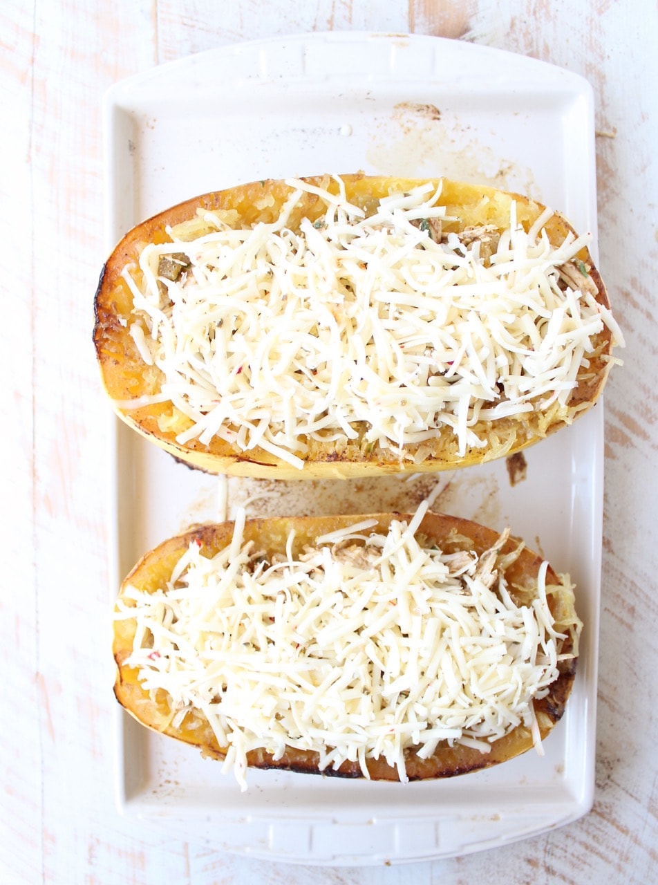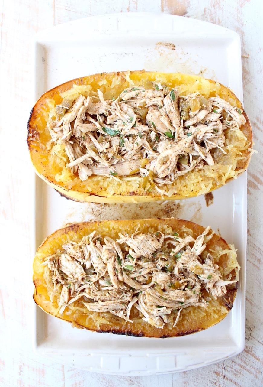 I looked over and saw a spaghetti squash sitting on the counter and the idea came to me. Roast the spaghetti squash, stuff it with green chili chicken, then melt a handful of cheese right on top!