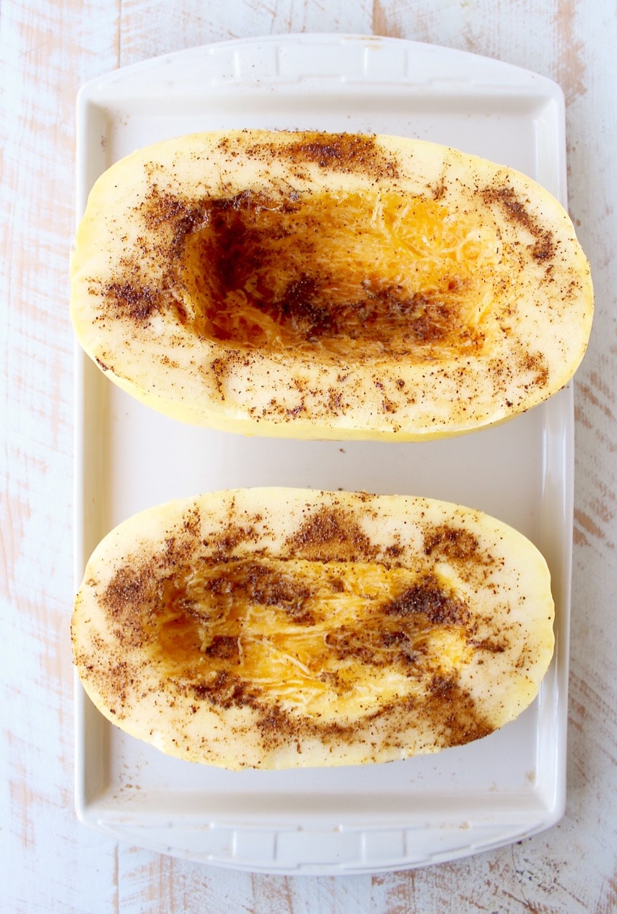 - Sprinkle 1 tsp of this mixture on each half of spaghetti squash, reserve the rest for later.
