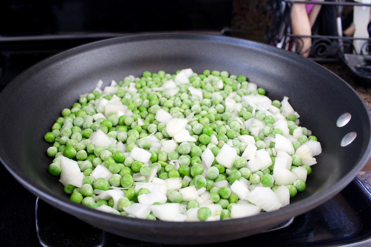 Heat the sesame oil in a large pan or wok over medium-high heat. Add the onions and peas.