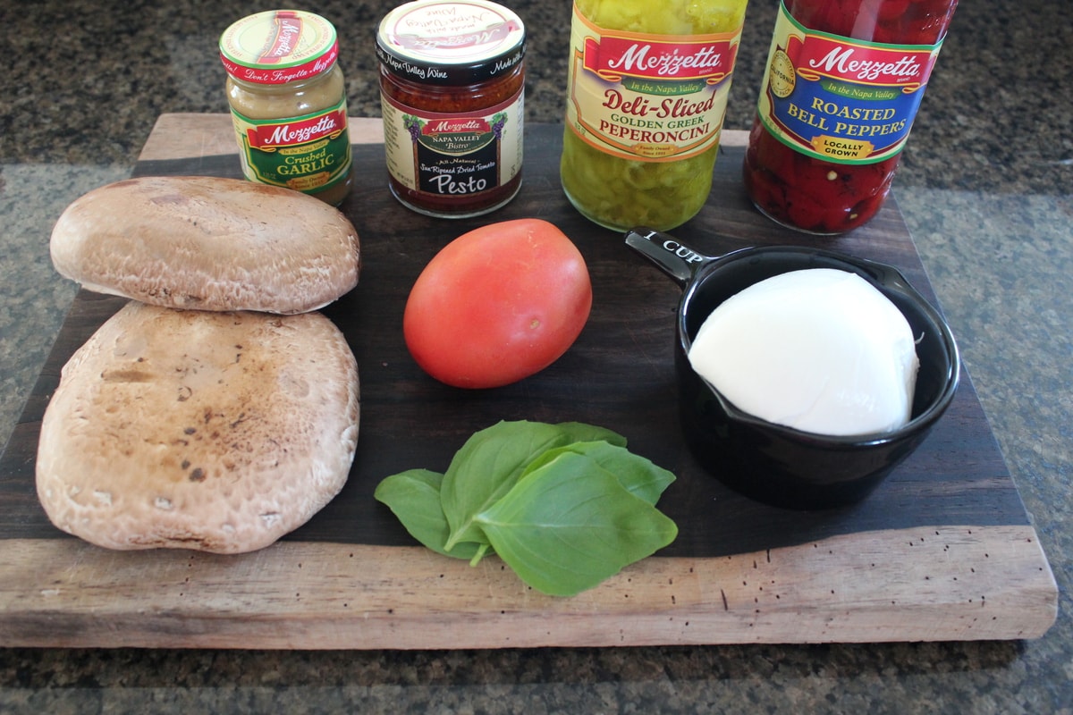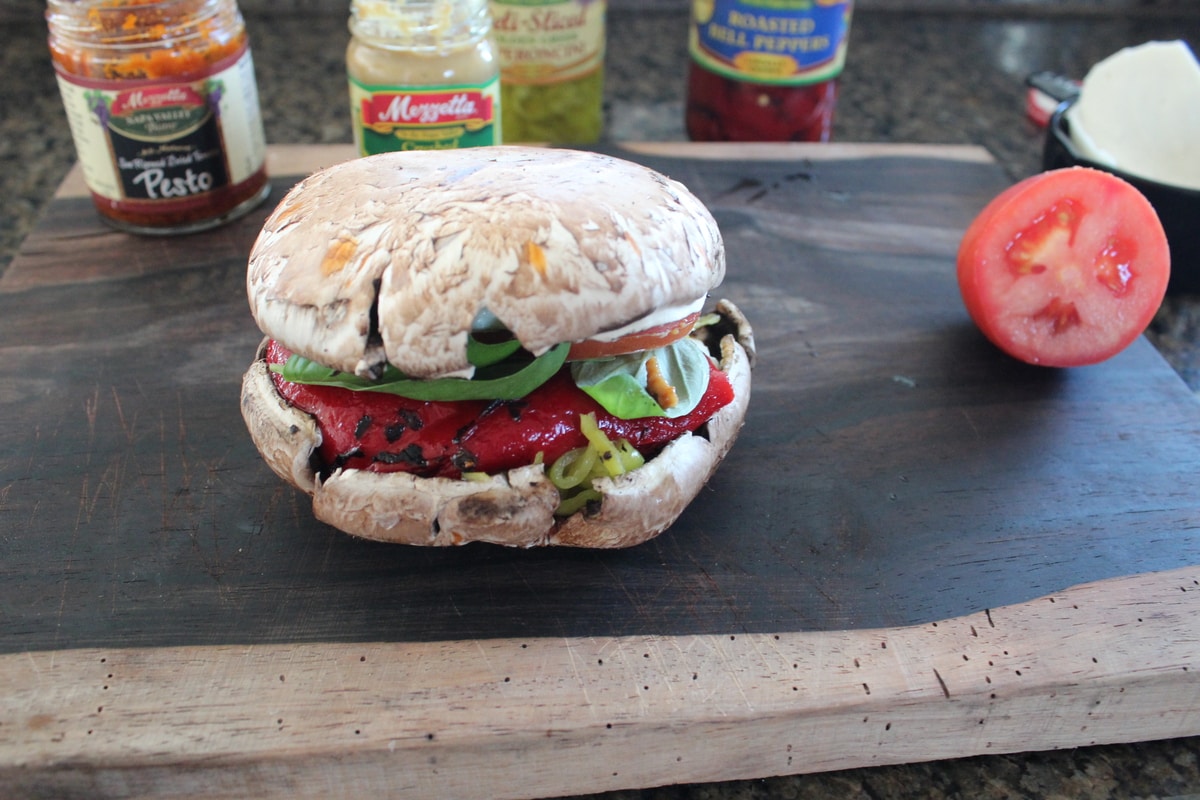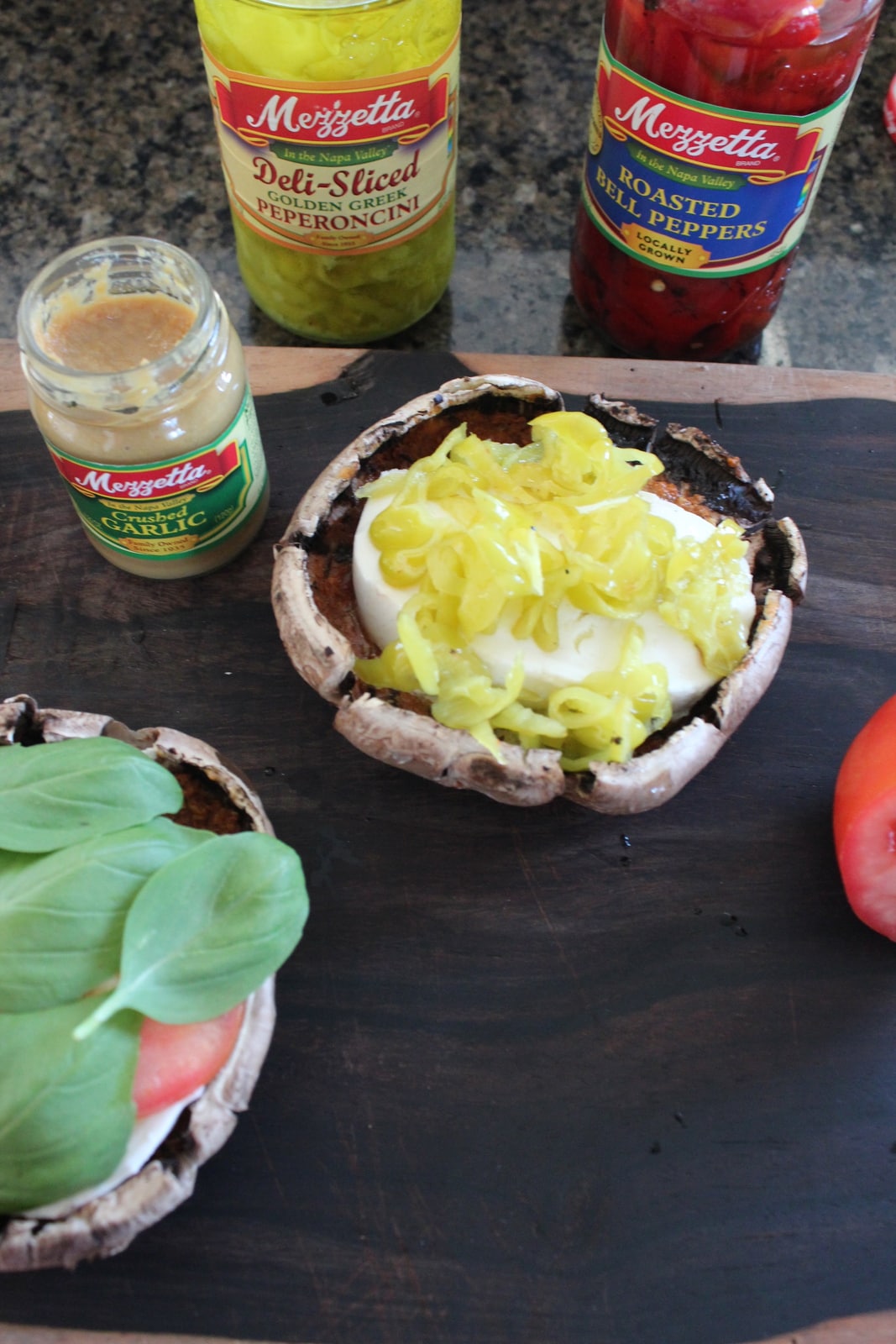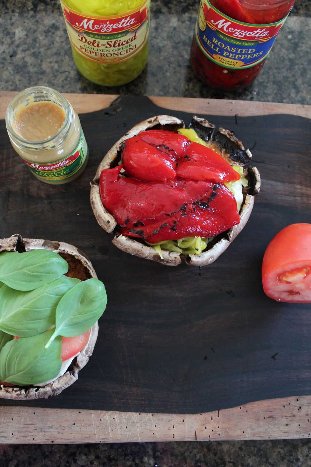 - On the other mushroom, top with the peperoncini’s and roasted bell peppers.