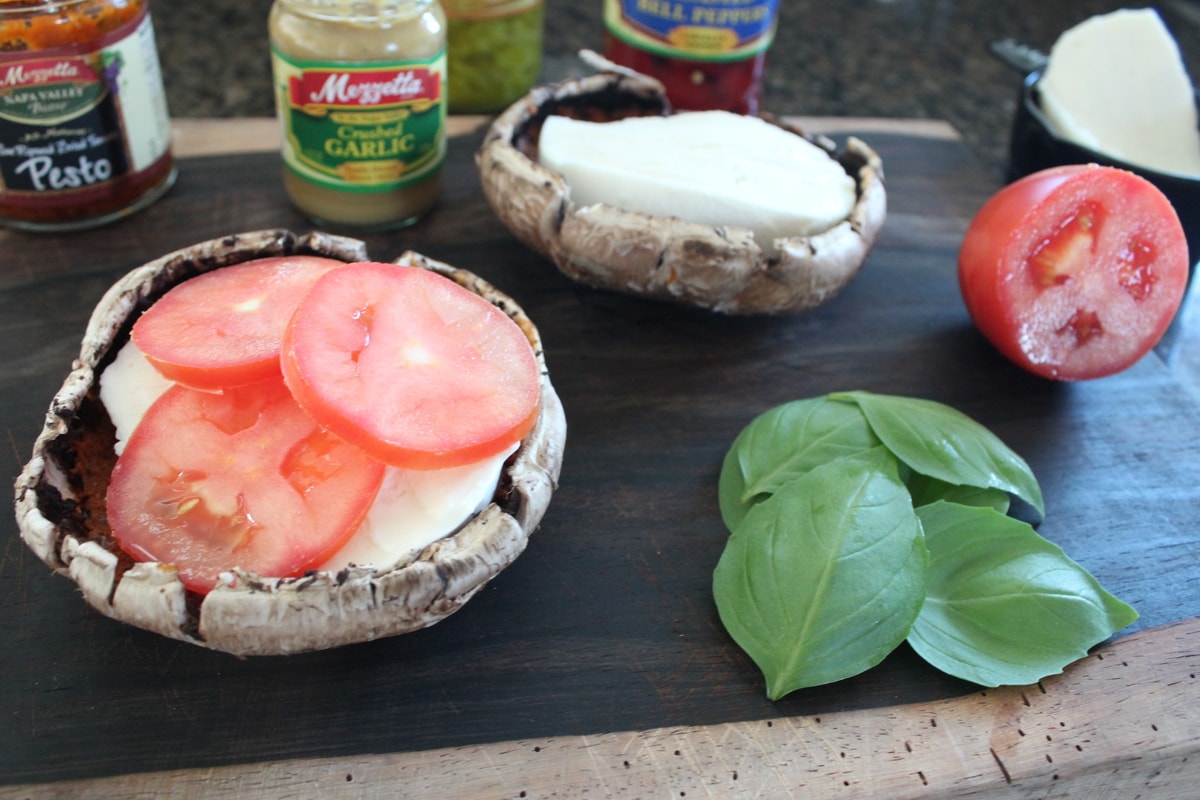 - Top one of the mushrooms with the sliced tomatoes and basil.