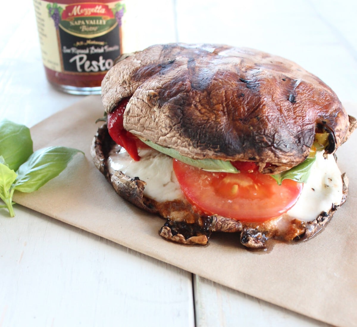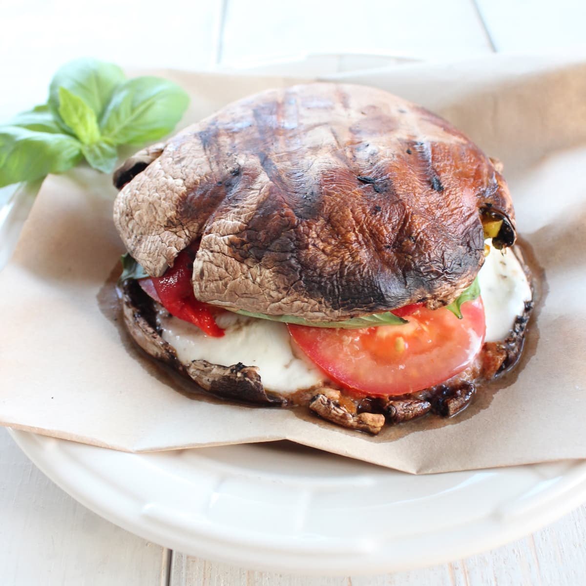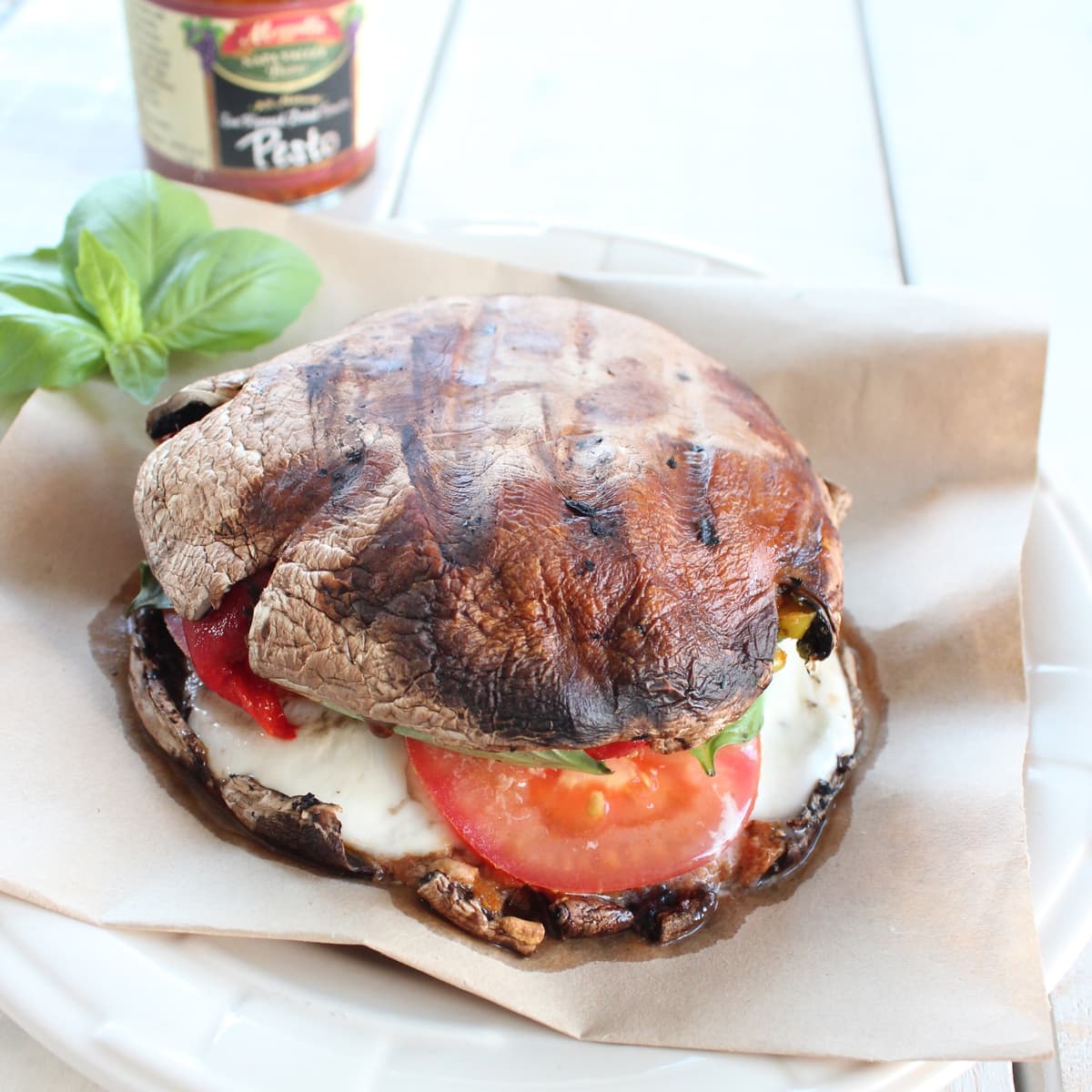 This vegetarian, gluten free Italian Grilled Portobello Caprese Sandwich combines fresh mozzarella, tomatoes & basil between two large portobello mushrooms.
