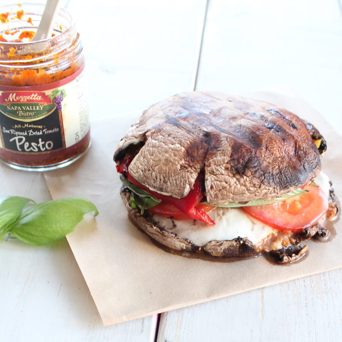 Two hearty portobello mushrooms filled with fresh mozzarella, sun dried tomato pesto and loads of other delicious flavors make this is a unique sandwich not to be missed!