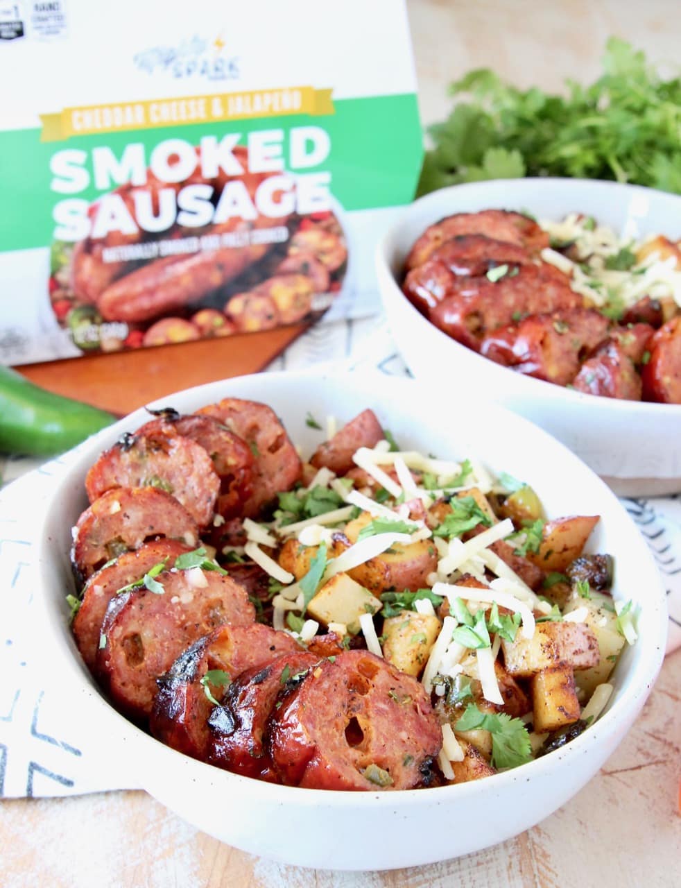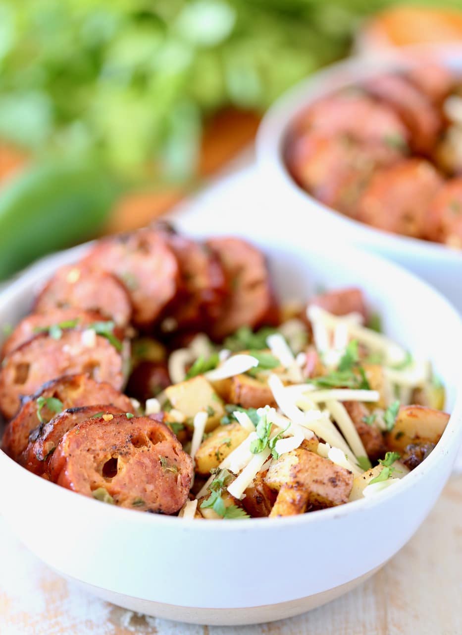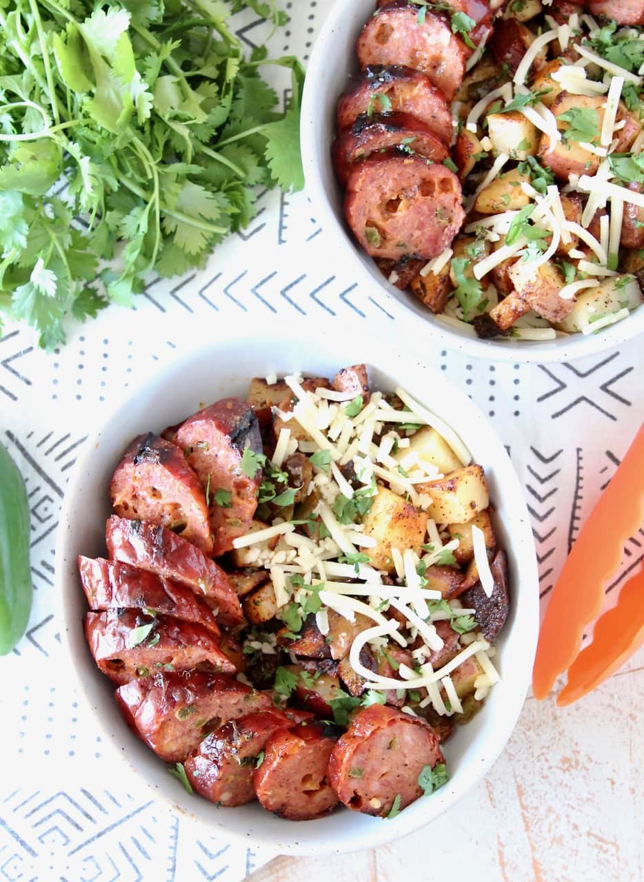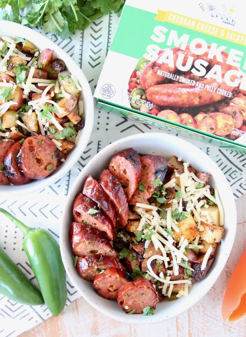 Diced red potatoes, bell peppers, jalapenos and garlic are tossed with olive oil, salt, pepper, paprika and cilantro to make a delicious base for the bowl, which is then topped with the scrumptious grilled jalapeno cheddar sausage and shredded cheddar cheese.
