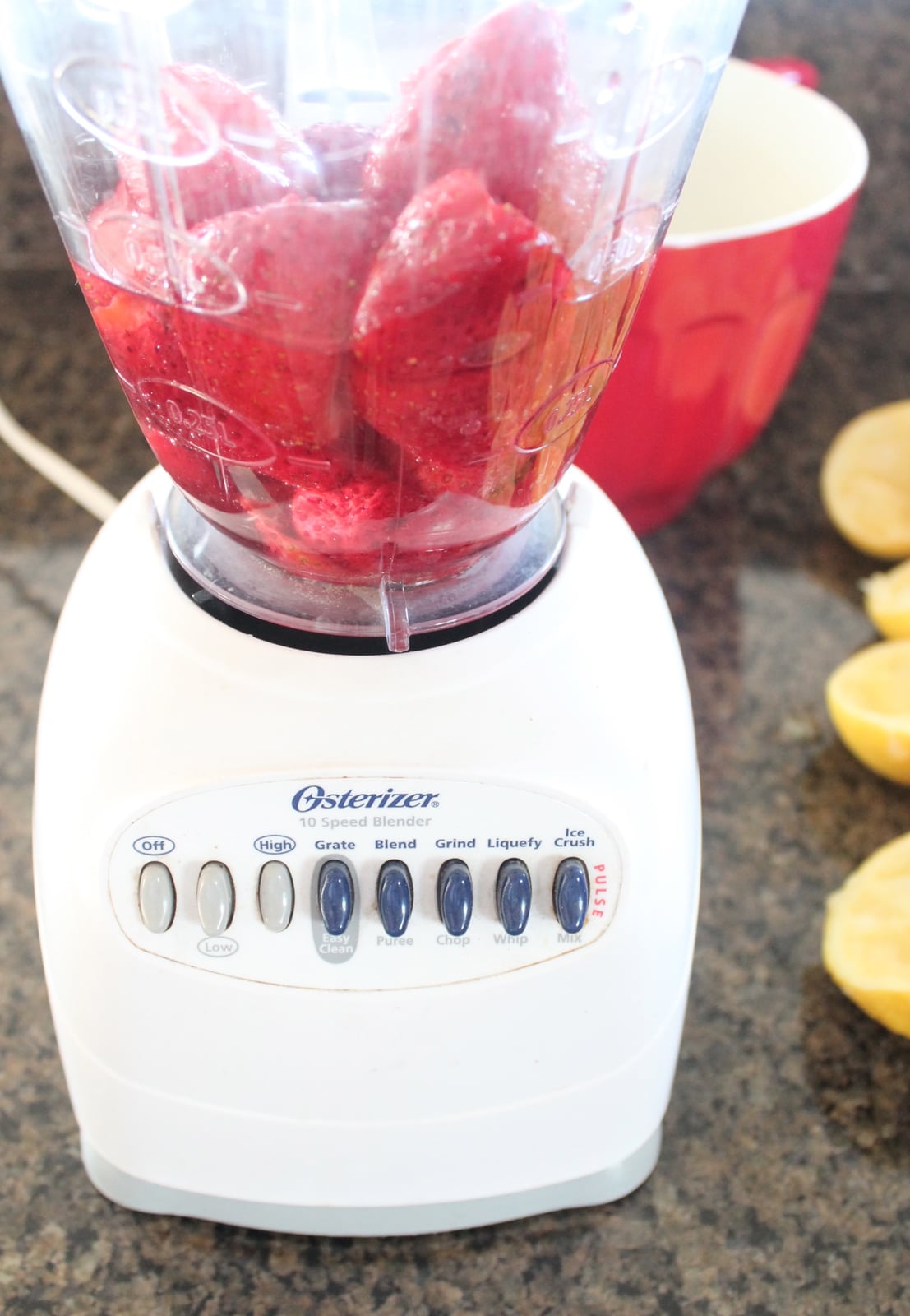 - Remove the stems and hull all of the strawberries, then roll them in the same bowl of sugar as the lemons.