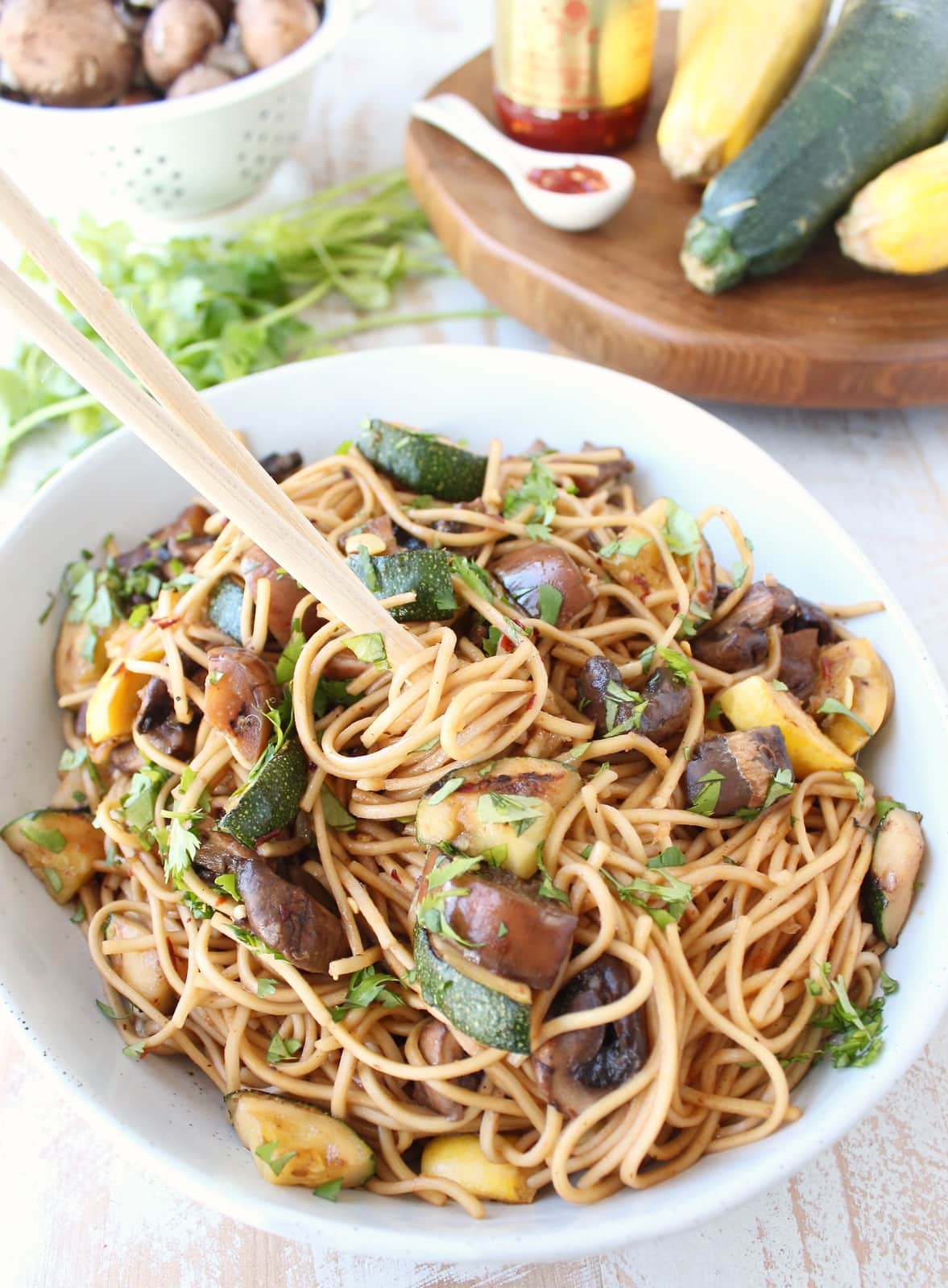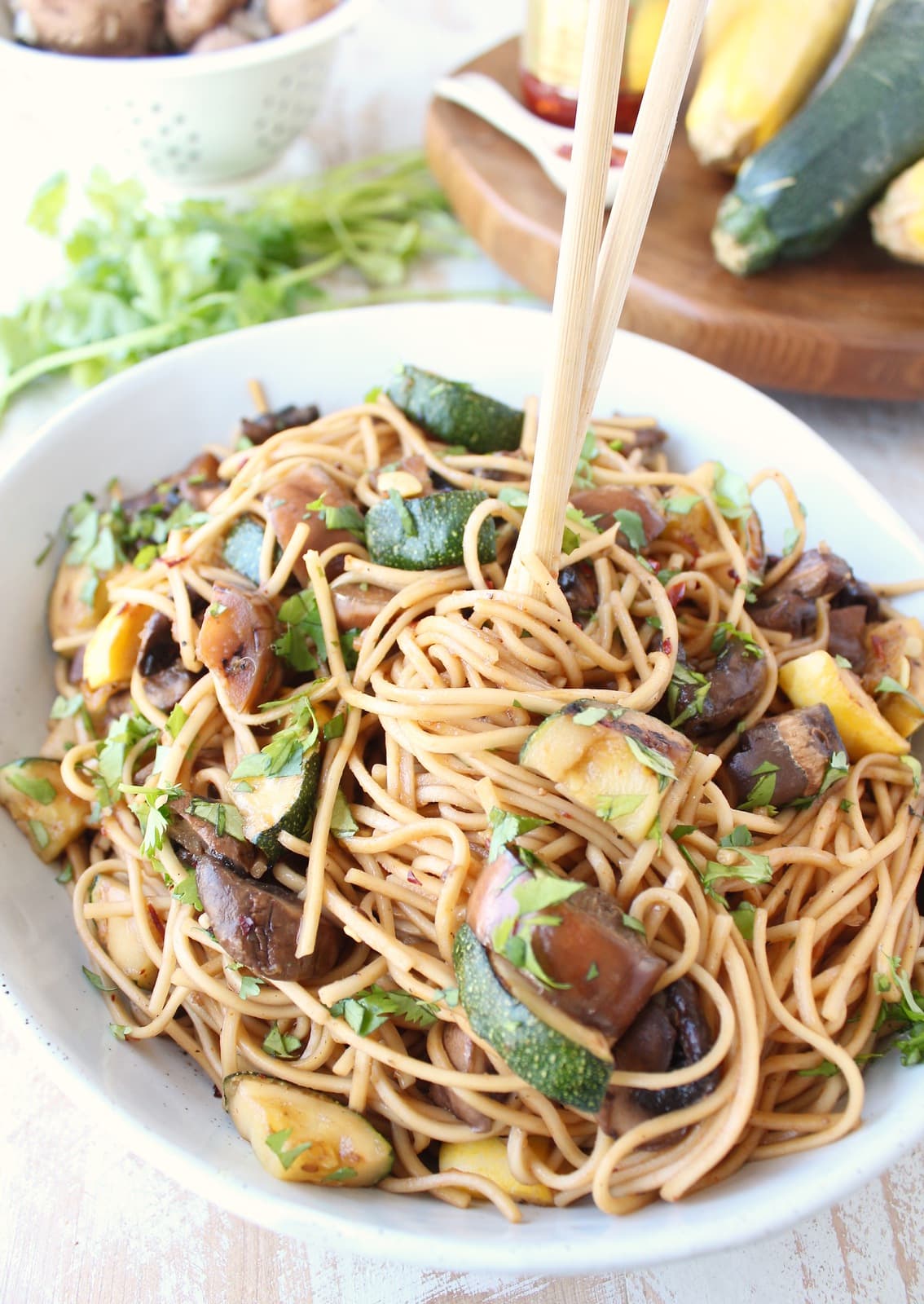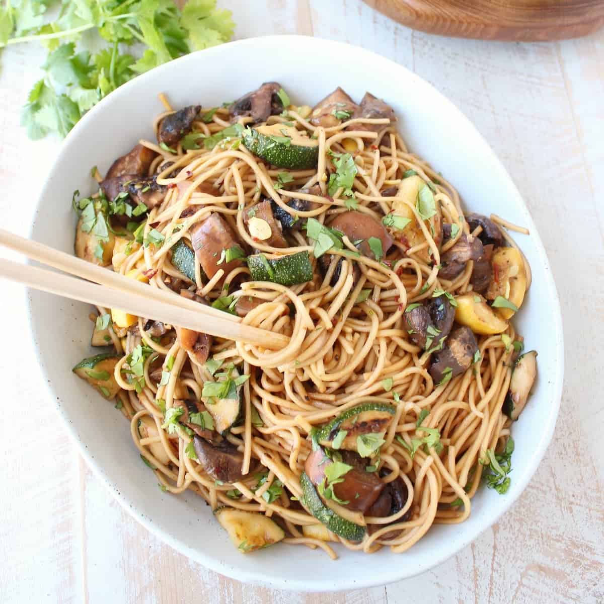 Fresh vegetables are tossed in an Asian marinade, grilled, then mixed with Lo Mein noodles and a simple Asian sauce for an easy summer vegetarian dinner!