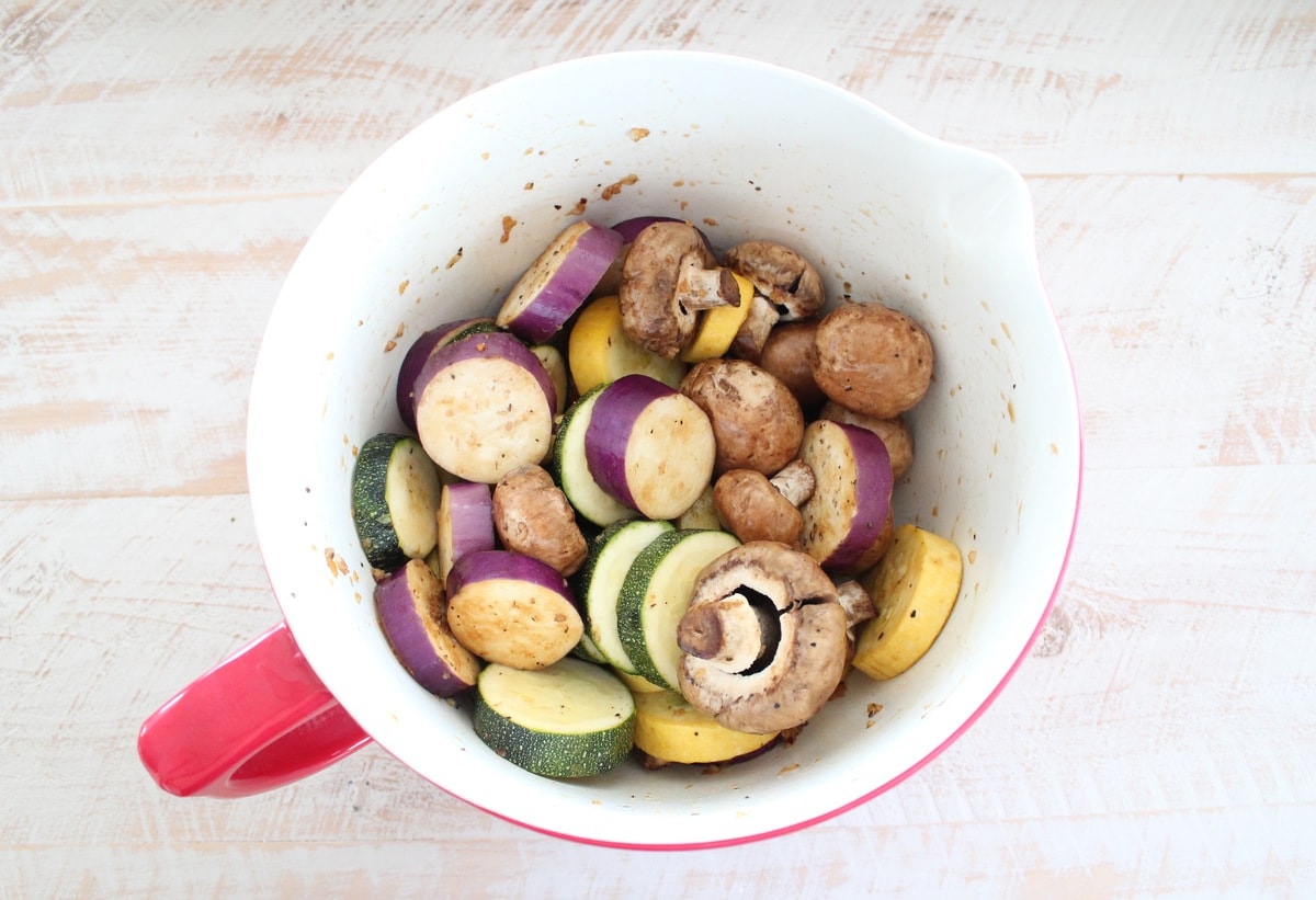- Toss in the zucchini, yellow squash, Japanese eggplant and baby bella mushrooms.
