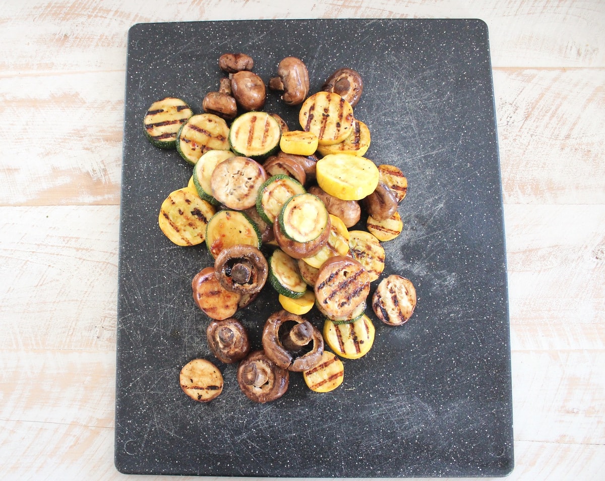 Begin by preparing the grilled vegetables.