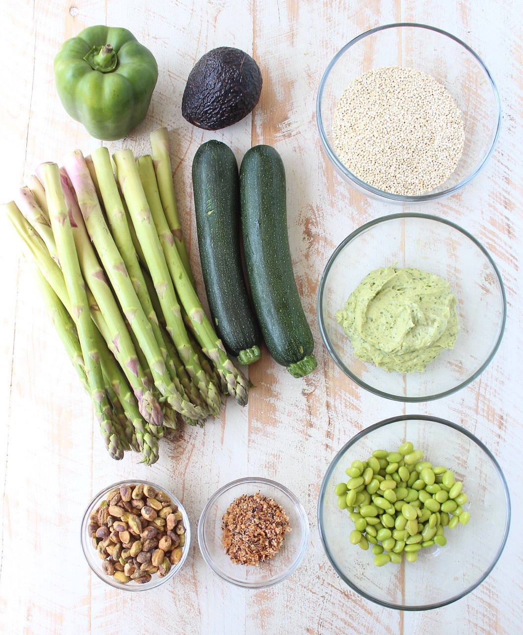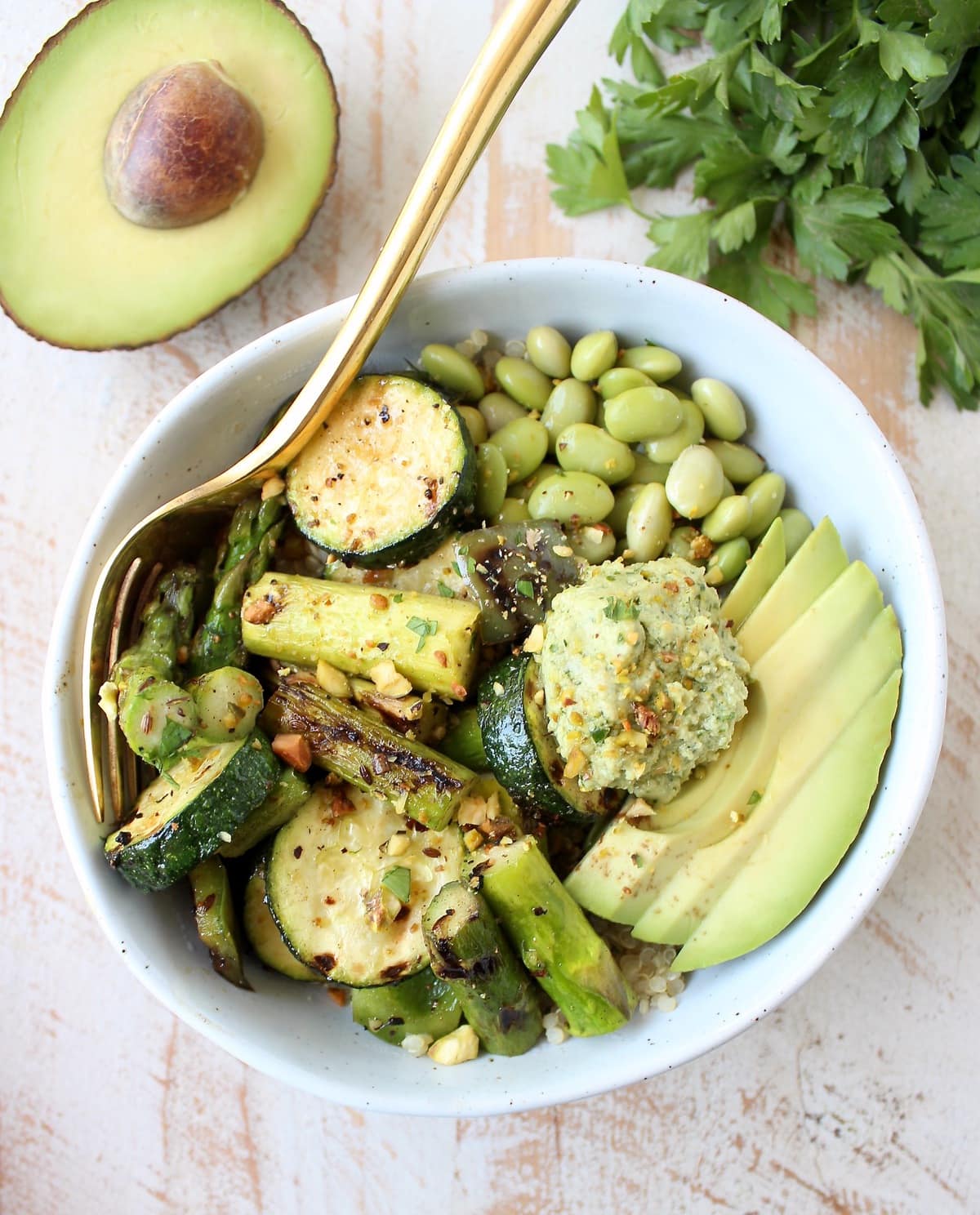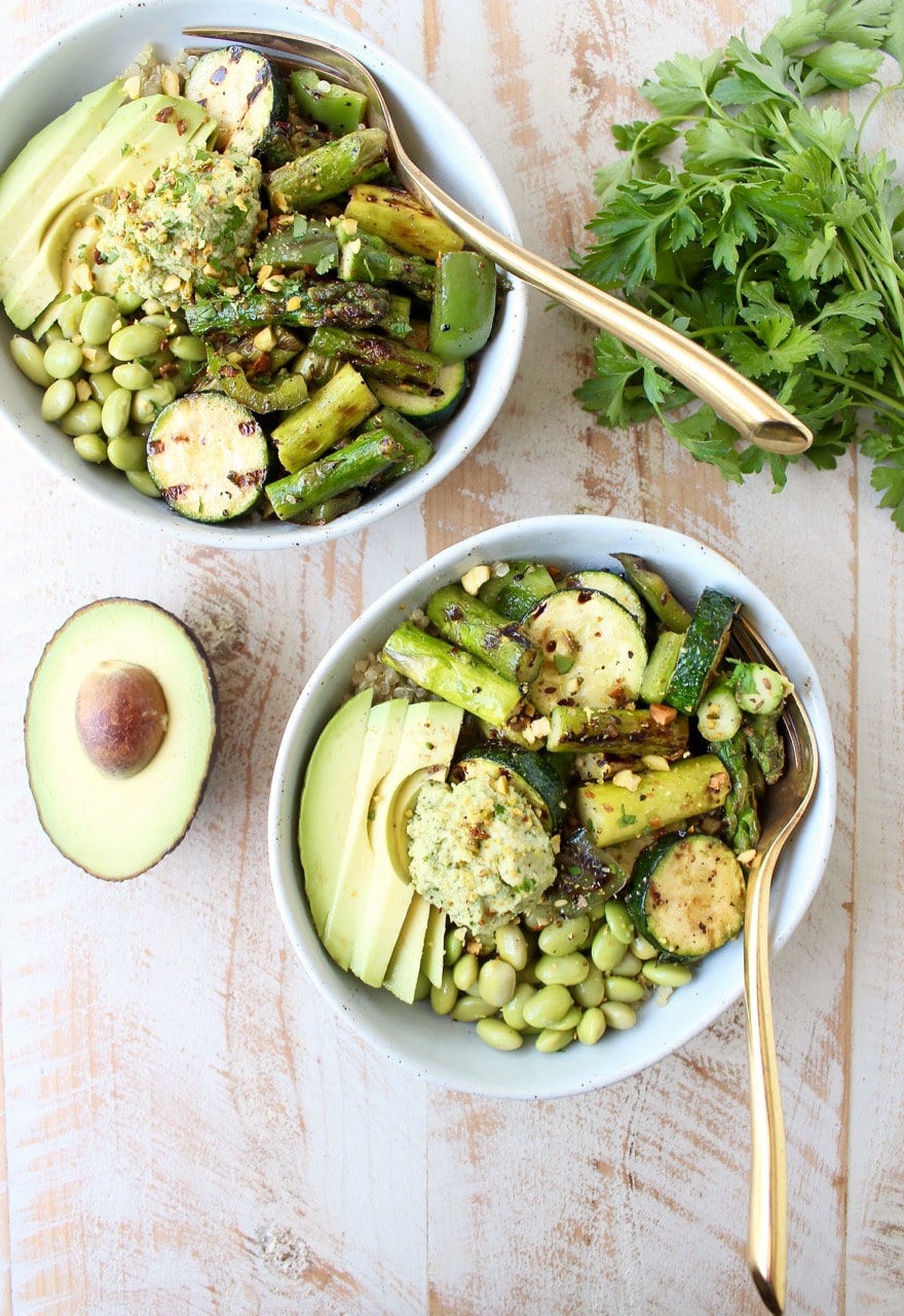 For this recipe, I grilled up all of my favorite green spring veggies, then tossed them on top of quinoa and added some of my other favorite greens, like avocado, edamame and green tahini sauce!