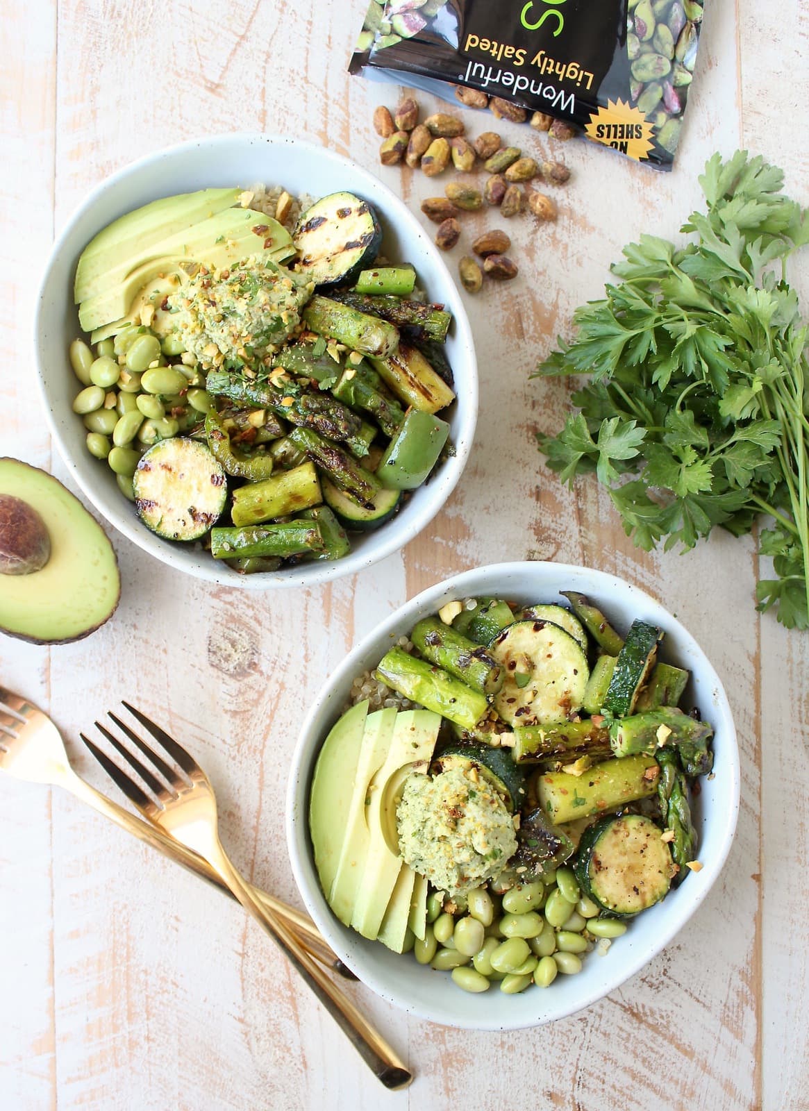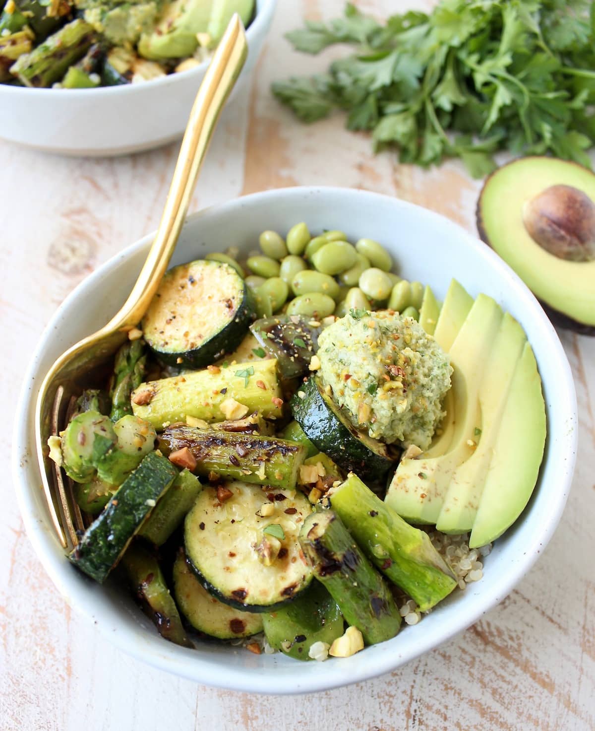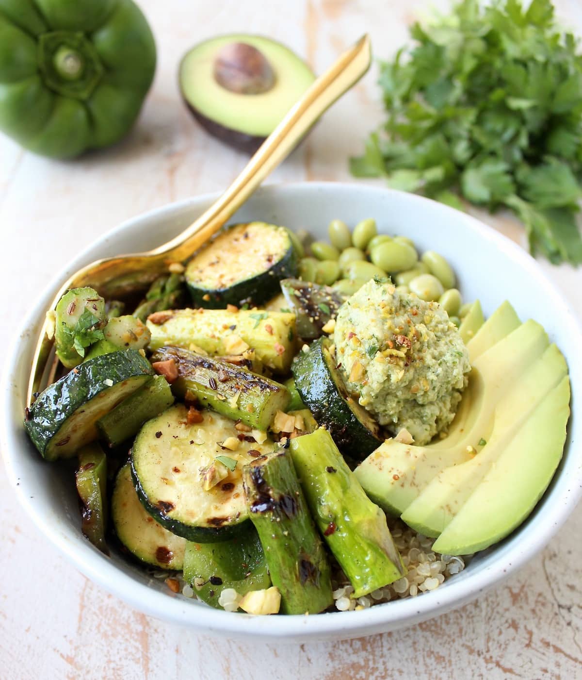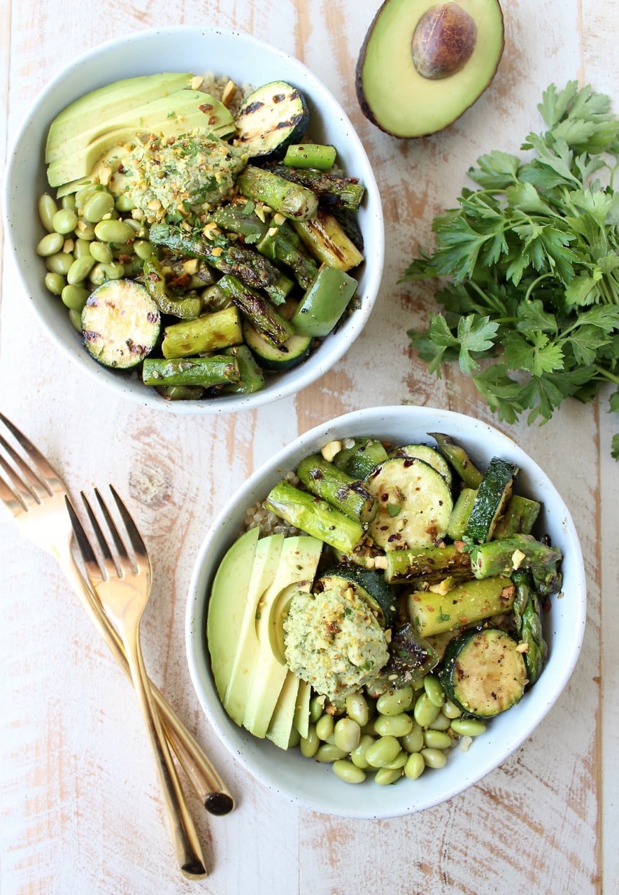 Once the veggies are grilled and quinoa is cooked, assemble the bowls by dividing the quinoa between 2-4 bowls. Top with the grilled veggies, avocado, edamame beans, pistachios and green tahini sauce.
