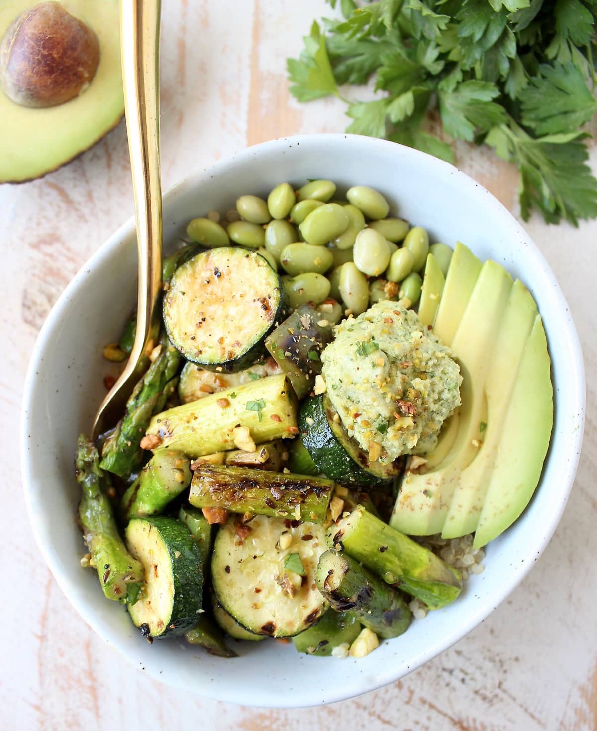 - Top with the grilled veggies, avocado, edamame beans, pistachios and green tahini sauce.