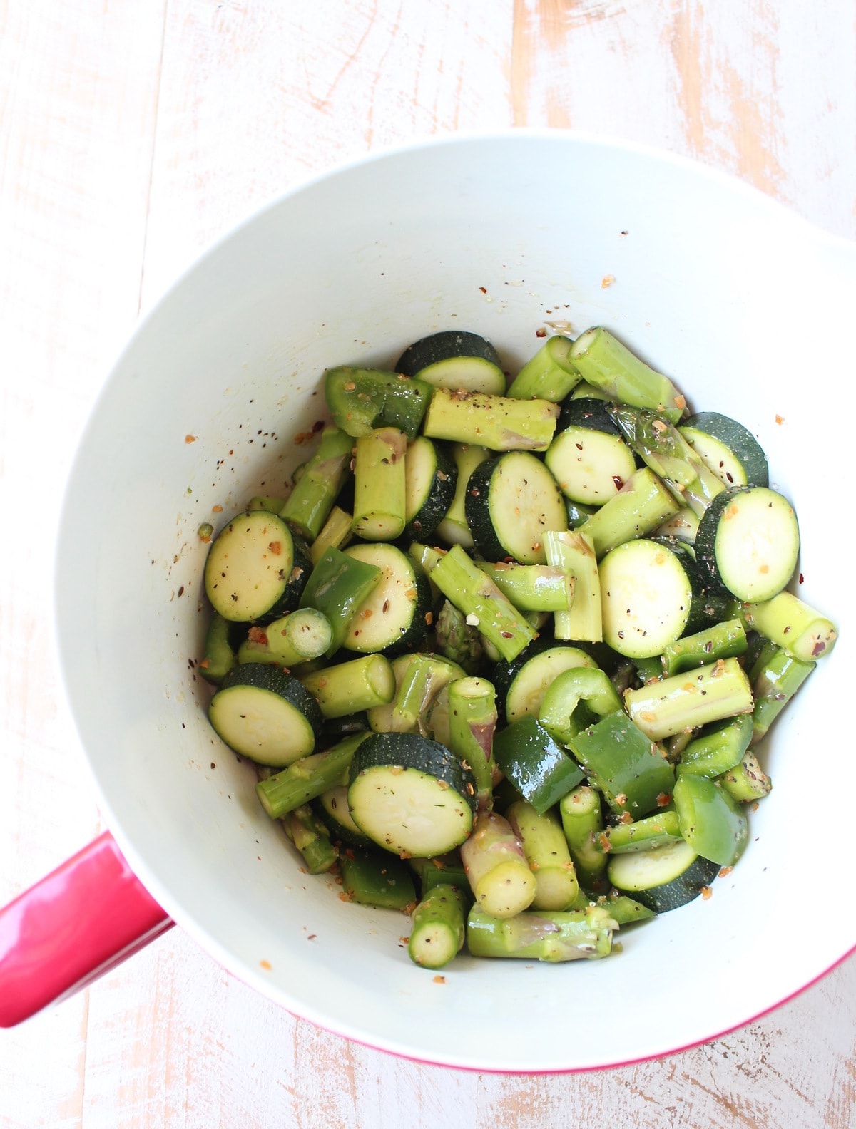 - Toss the asparagus, bell pepper and zucchini with the olive oil and steak seasoning.