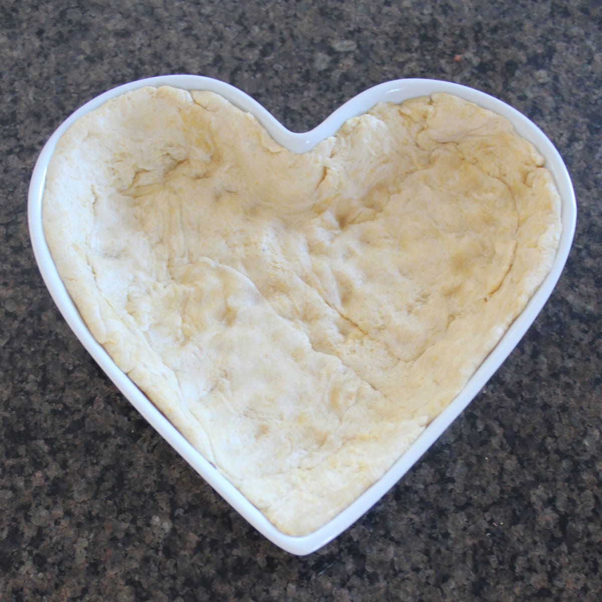 Press the dough into a 10″ heart shaped pan, which you can find at this link on Amazon for $10 or basically any store that carries Valentine’s Day supplies like grocery stores, Wal-Mart or Target.