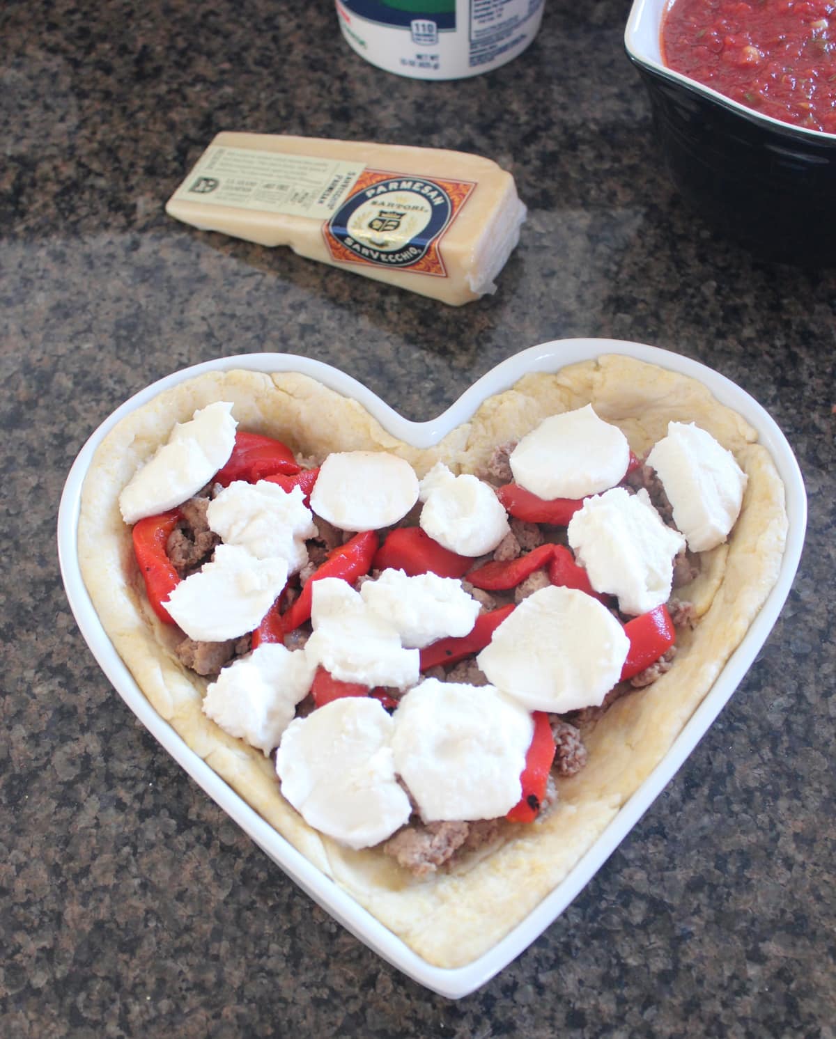 This heart shaped pizza is made with a homemade deep dish crust. It’s filled with sweet Italian sausage, roasted red peppers, three cheeses & homemade sauce.