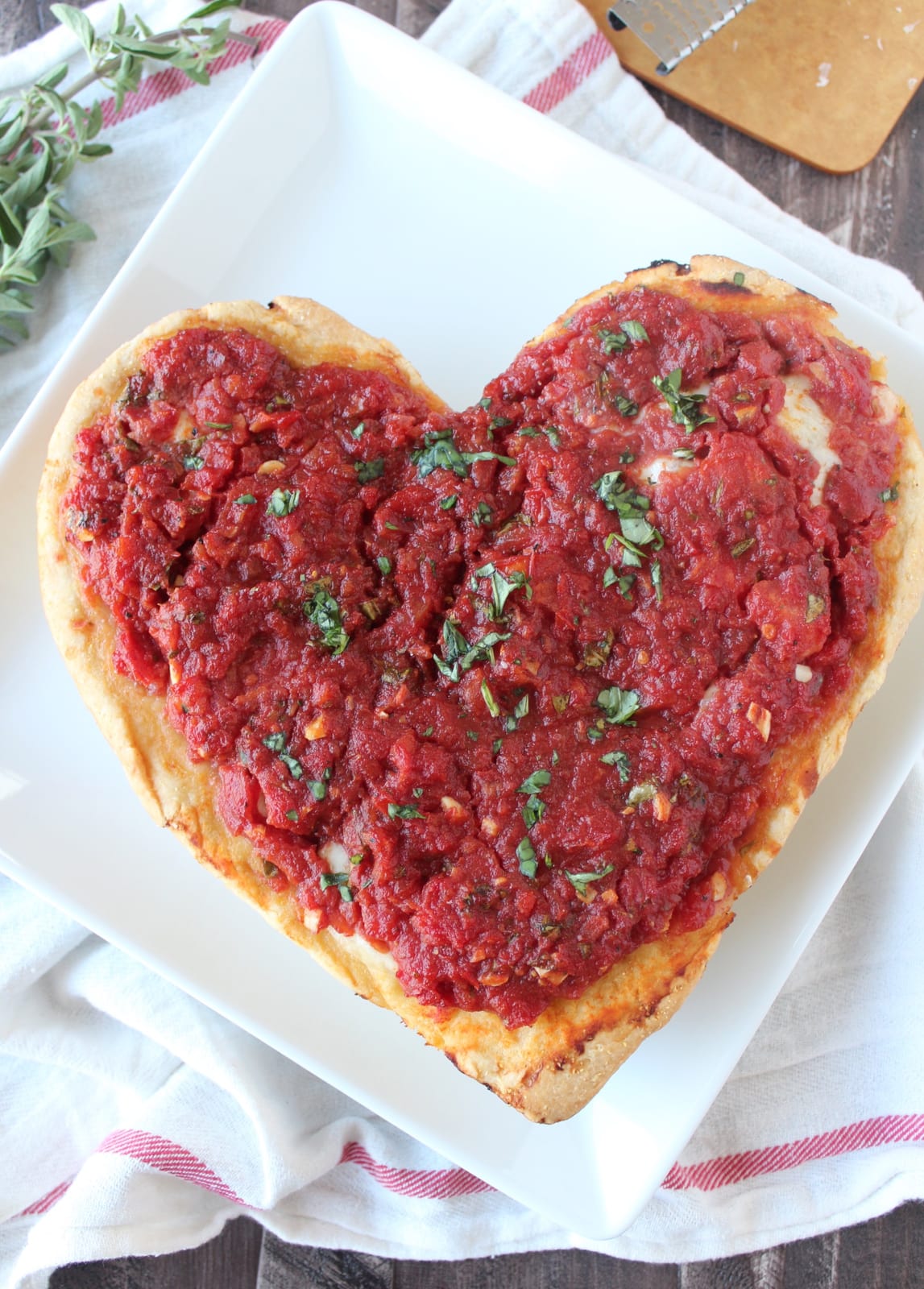 Ever since I began planning a trip to Chicago, I’ve been totally craving deep dish pizza. I decided to take my favorite deep dish crust recipe and use it for my heart-shaped pizza!