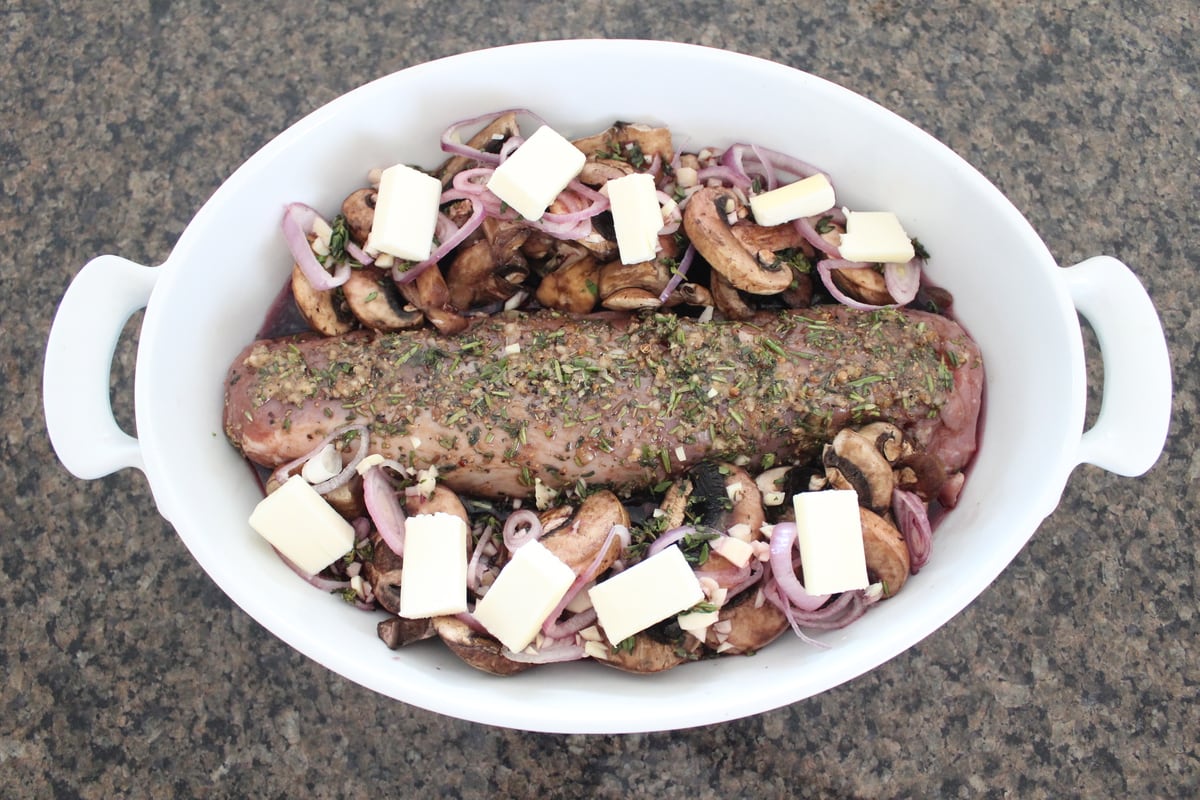 • Add the mushrooms, 3 cloves minced garlic, shallot, red wine & remaining 1 tbsp fresh chopped thyme to the baking dish around the pork tenderloin.