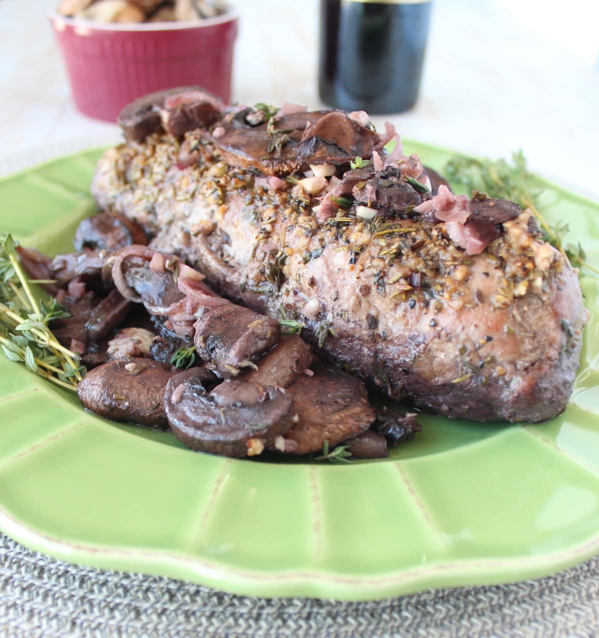 Lean pork tenderloin is rubbed with garlic and herbs, then roasted in a red wine mushroom sauce for a dish that’s full of flavor!