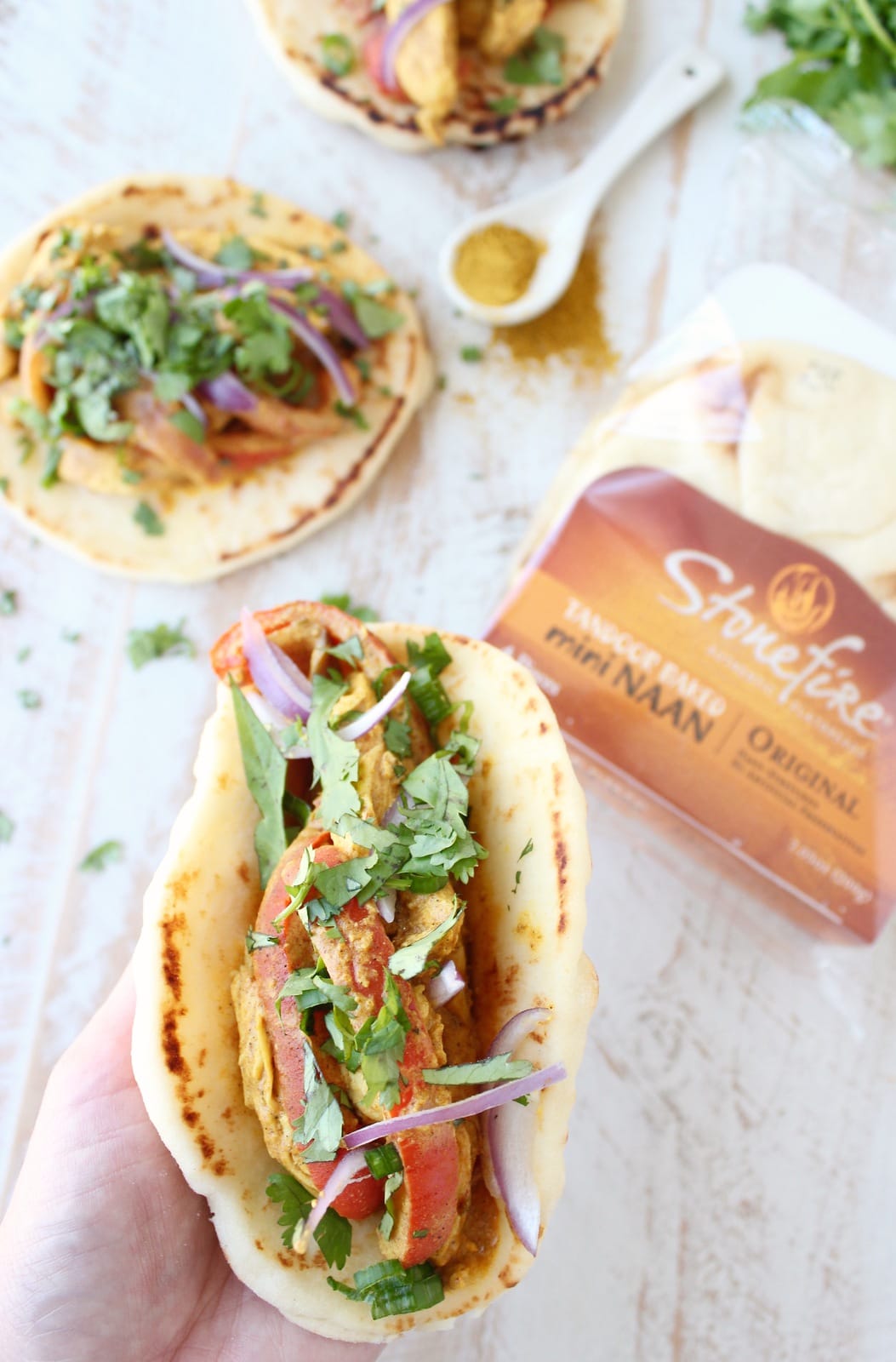 This recipe for Indian Tacos with Curry Chicken combines an easy, homemade yellow curry sauce, with tender chicken spooned into Naan bread for a delicious meal!
