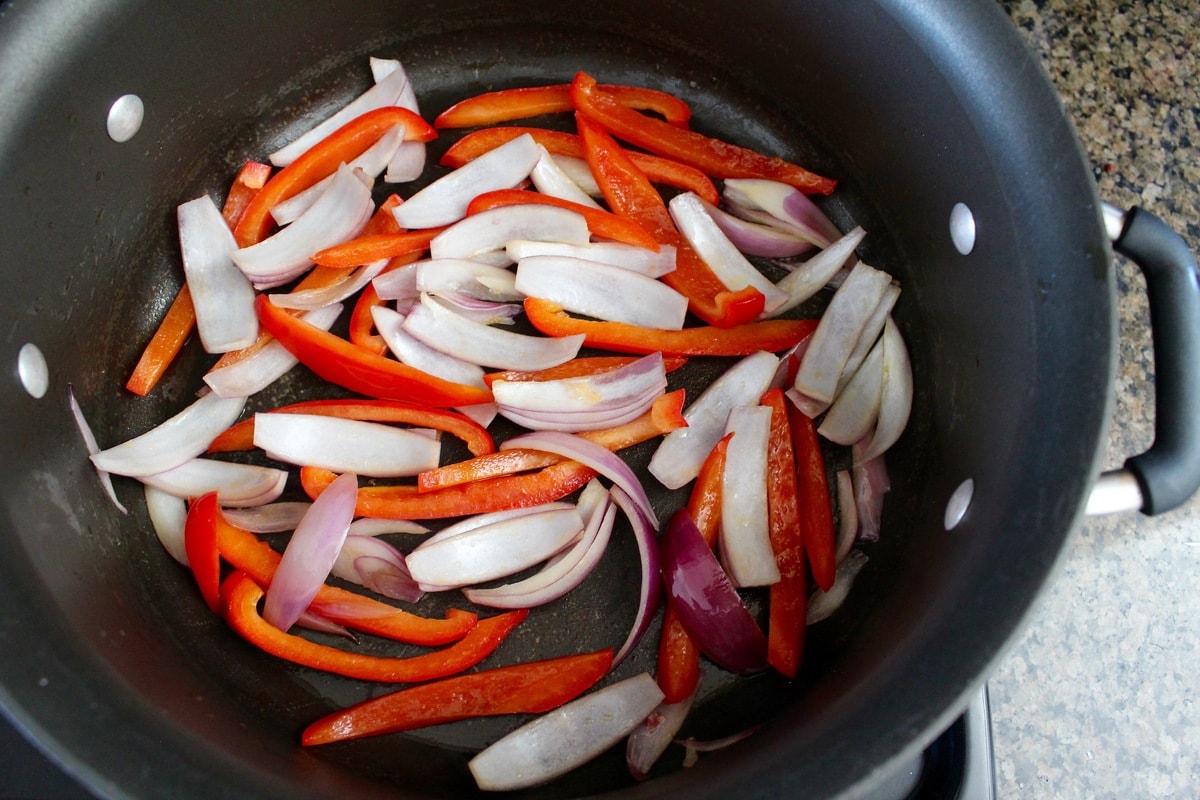 - Add the bell pepper and onion, cook 5-7 minutes.