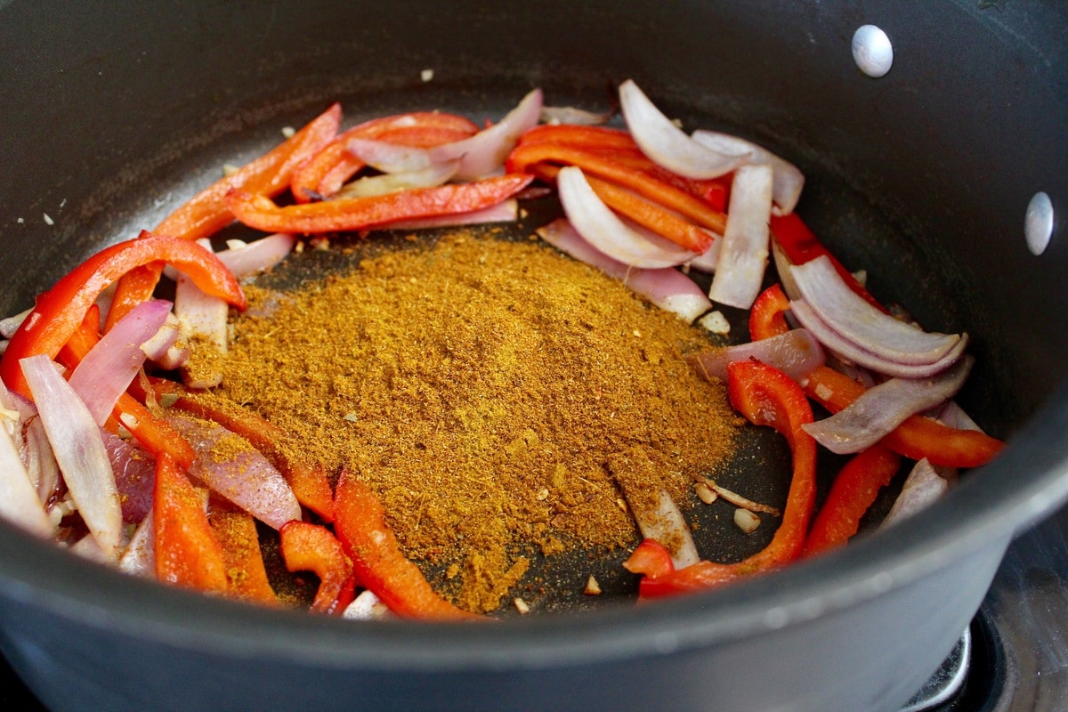 Add the spice mix to the peppers, onions and garlic. Toast for 30-60 seconds.