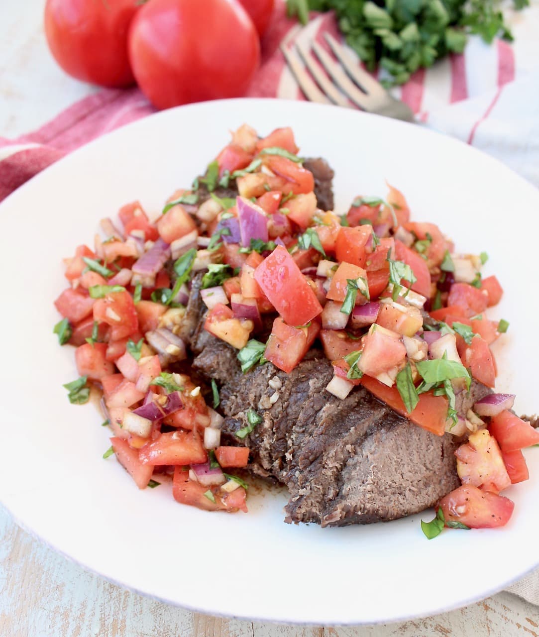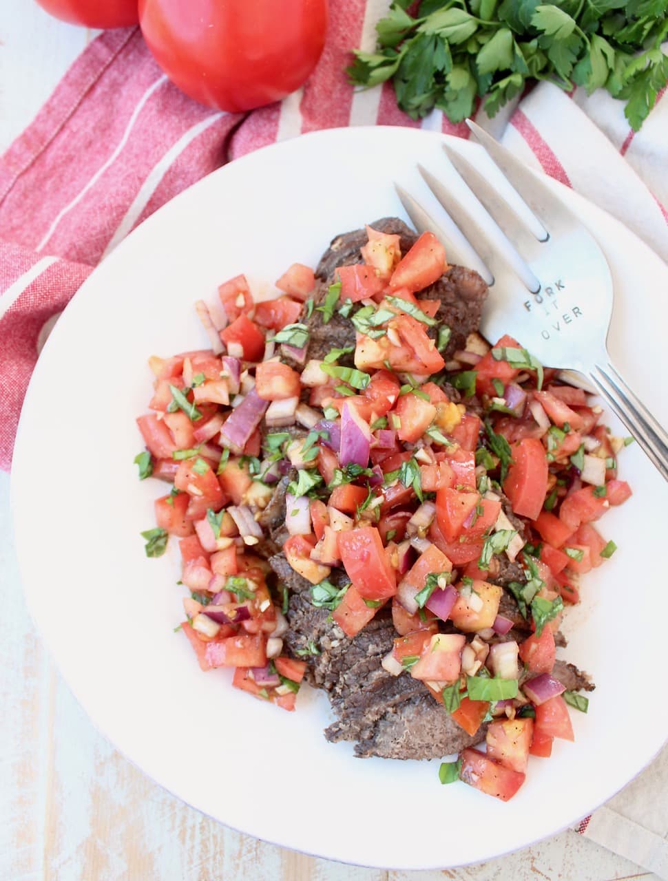 What a perfect way to keep the kitchen cool in the summer – I love slow cooker and Instant Pot recipes for easy summer meals that don’t heat up the kitchen! And I just looooove all the fresh, healthy summer flavors piled on top! A terrific twist on steak … and on bruschetta!