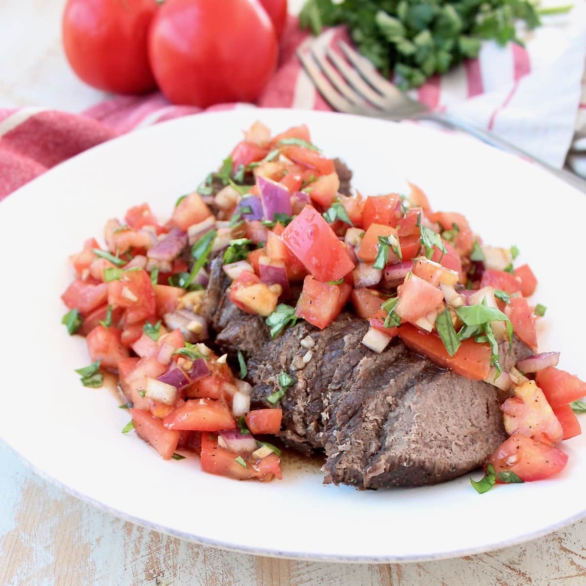 After the beef has marinated, sear it in an Instant Pot, then pressure cook the beef for 10 minutes. Remove the beef, rest for 5-10 minutes, then slice. Toss the tomato basil bruschetta together and spoon on top of the sliced beef.