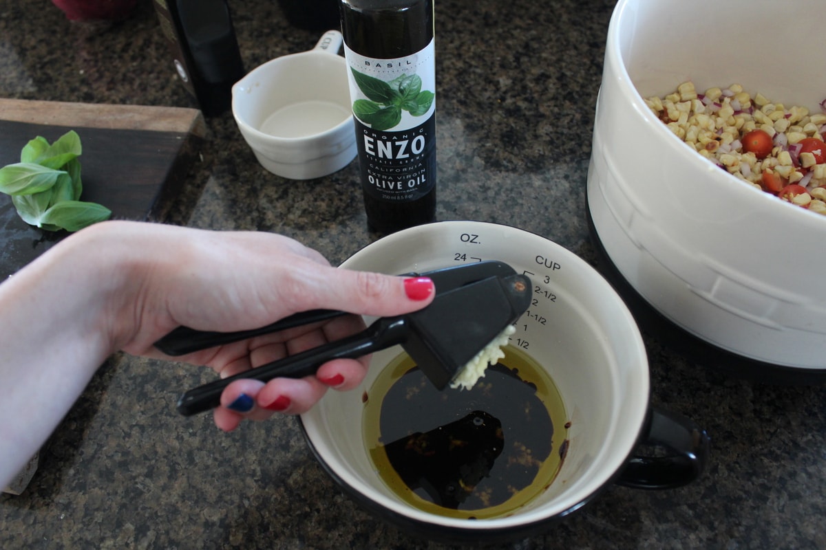 - Whisk the olive oil, balsamic vinegar, garlic and basil together in a small bowl.