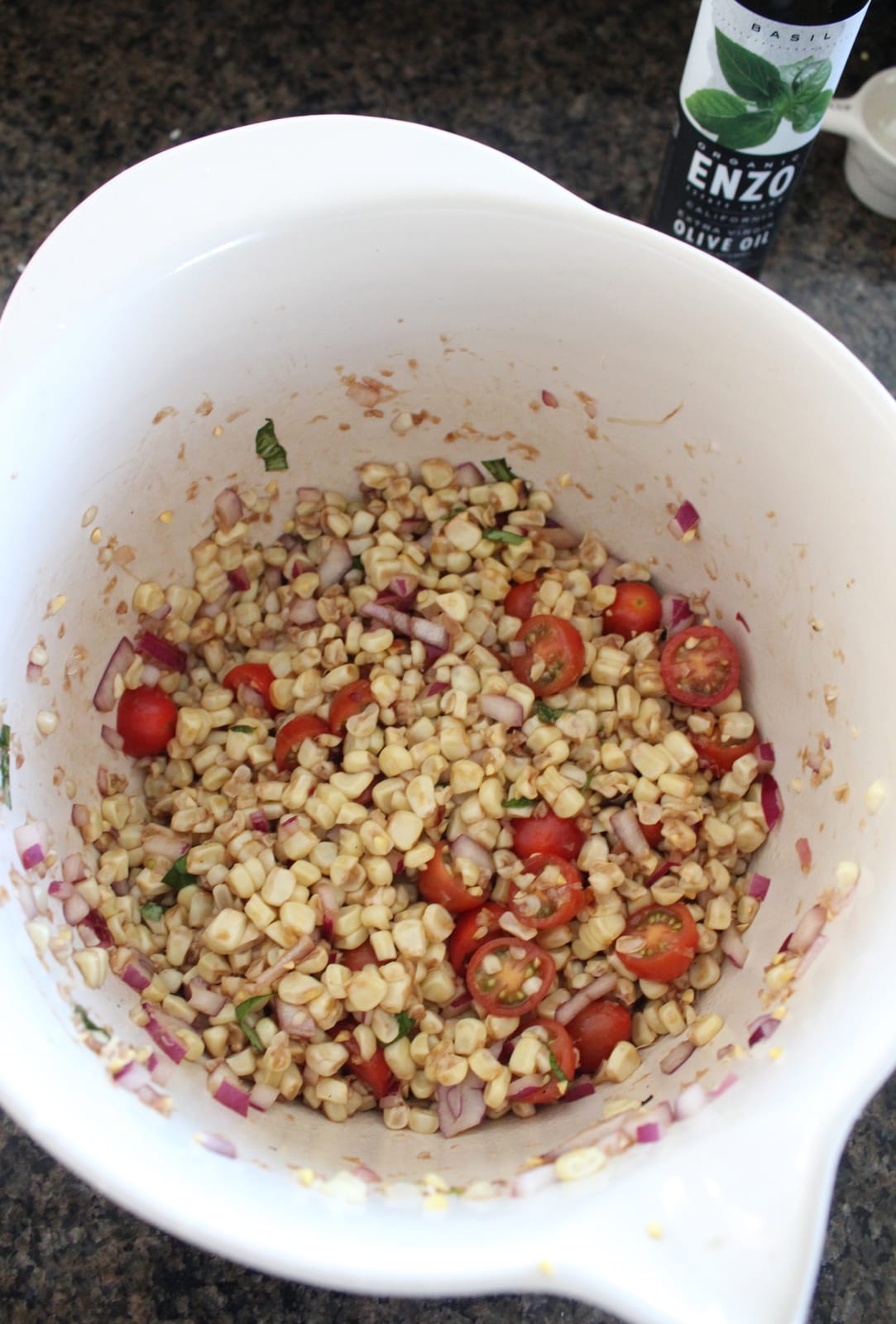 - Place the corn in a large bowl with the tomatoes and red onion.