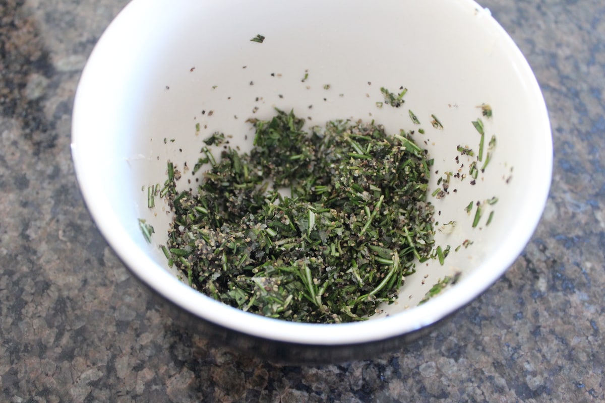 - In a small bowl, combine the olive oil, shallot, garlic, thyme, rosemary, salt and pepper.