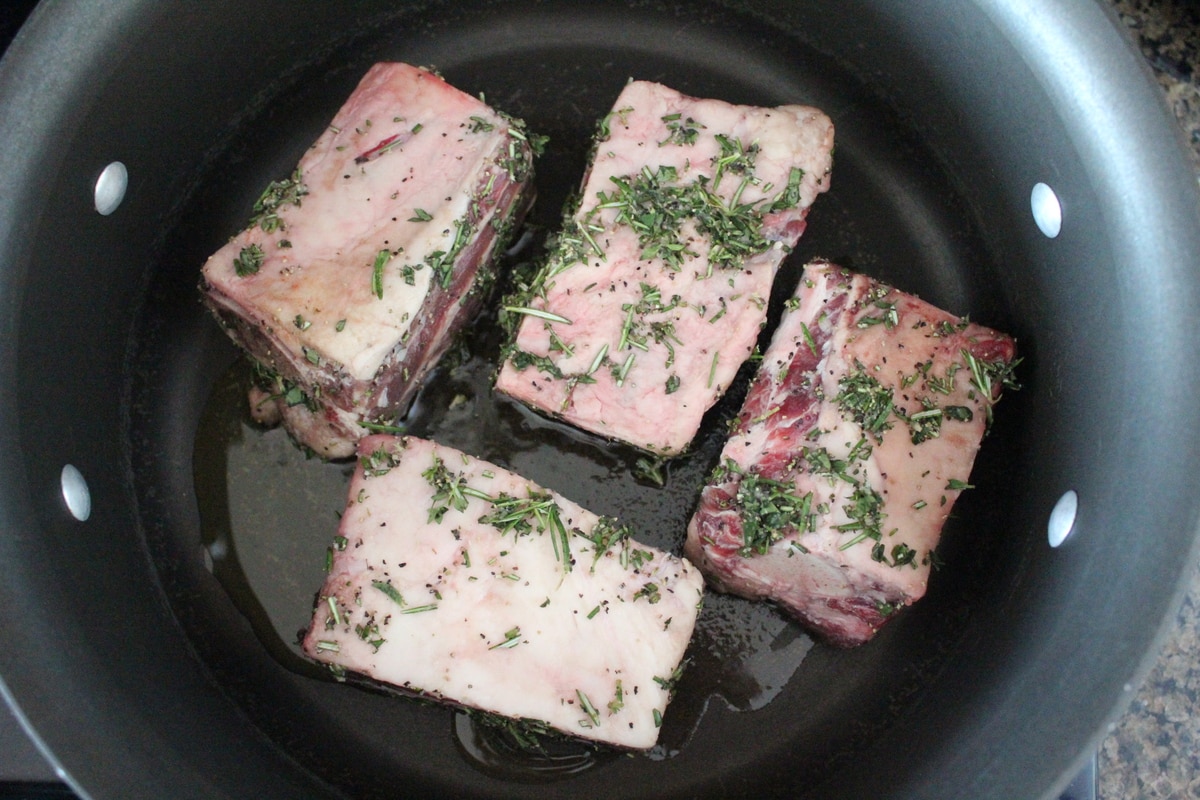 • Add the short ribs to the pot and sear over medium-high heat on each side.