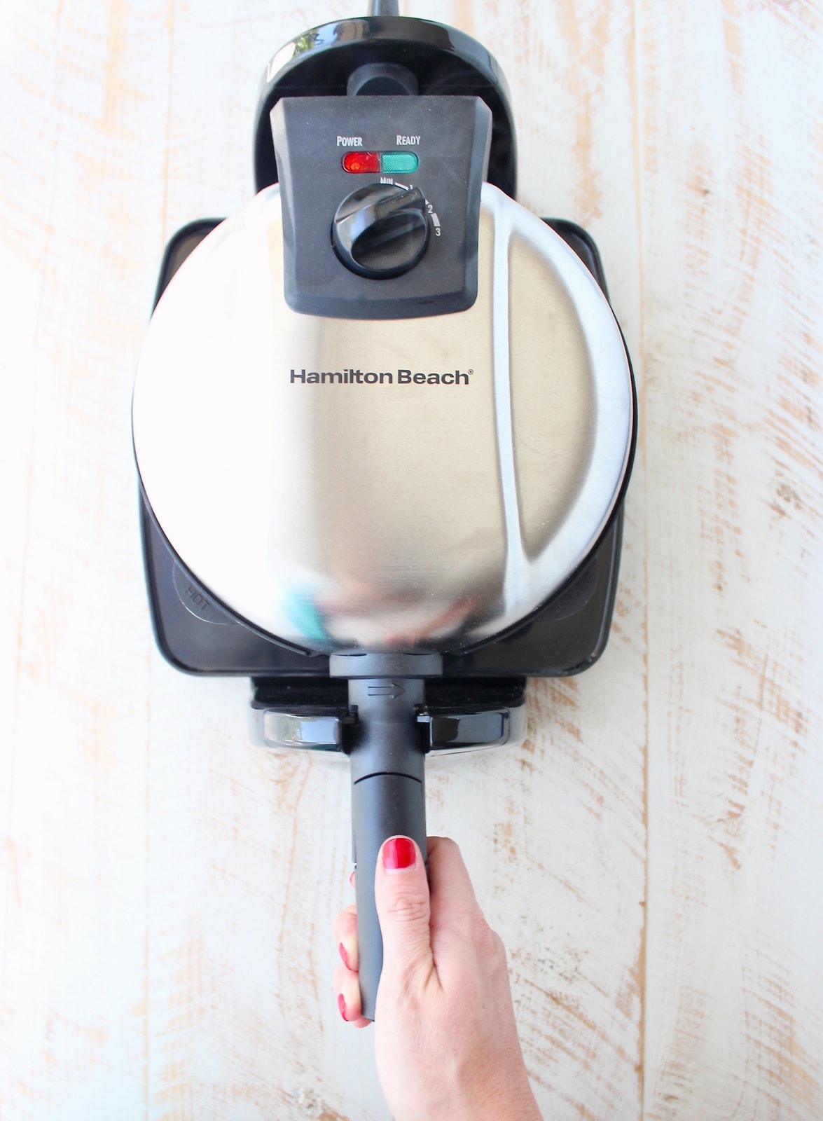 - Plug in the Hamilton Beach Belgian Waffle Iron and set to 2.