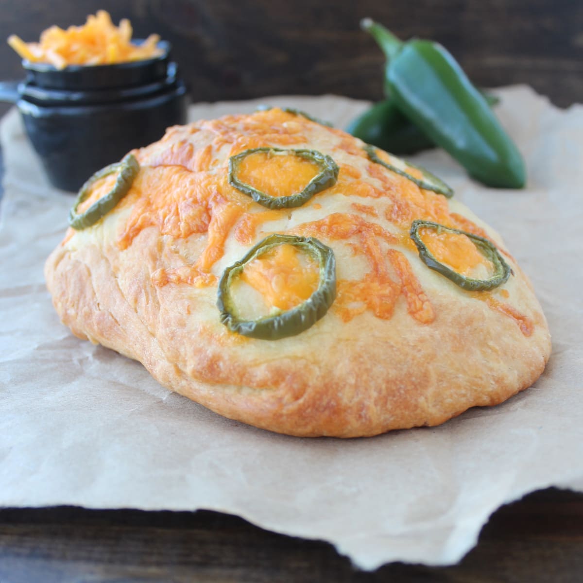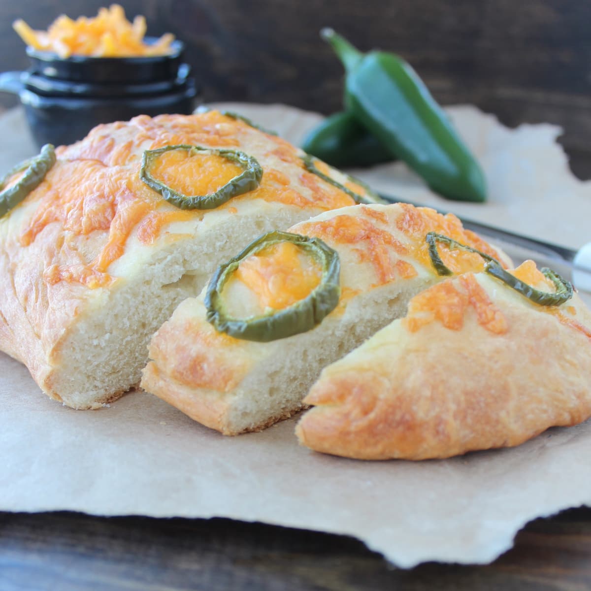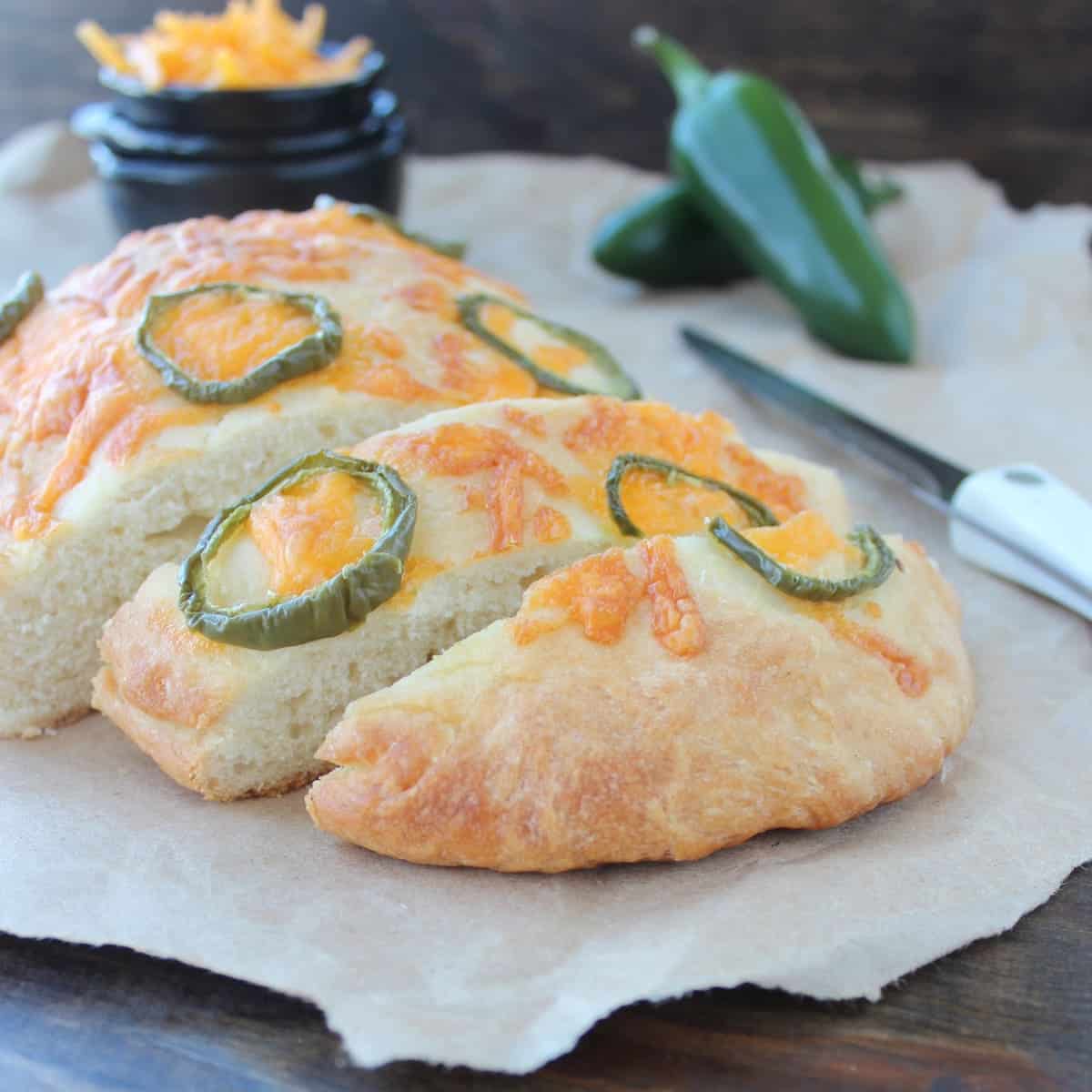 Classic focaccia bread is given a cheesy, spicy twist in this easy recipe for Jalapeno Cheddar Focaccia Bread, perfect for dipping in soups & chilies!