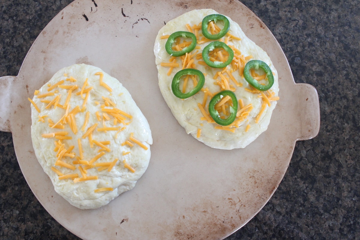 Brush 1 tbsp of olive oil on each loaf. Top each loaf with cheddar cheese and jalapenos.