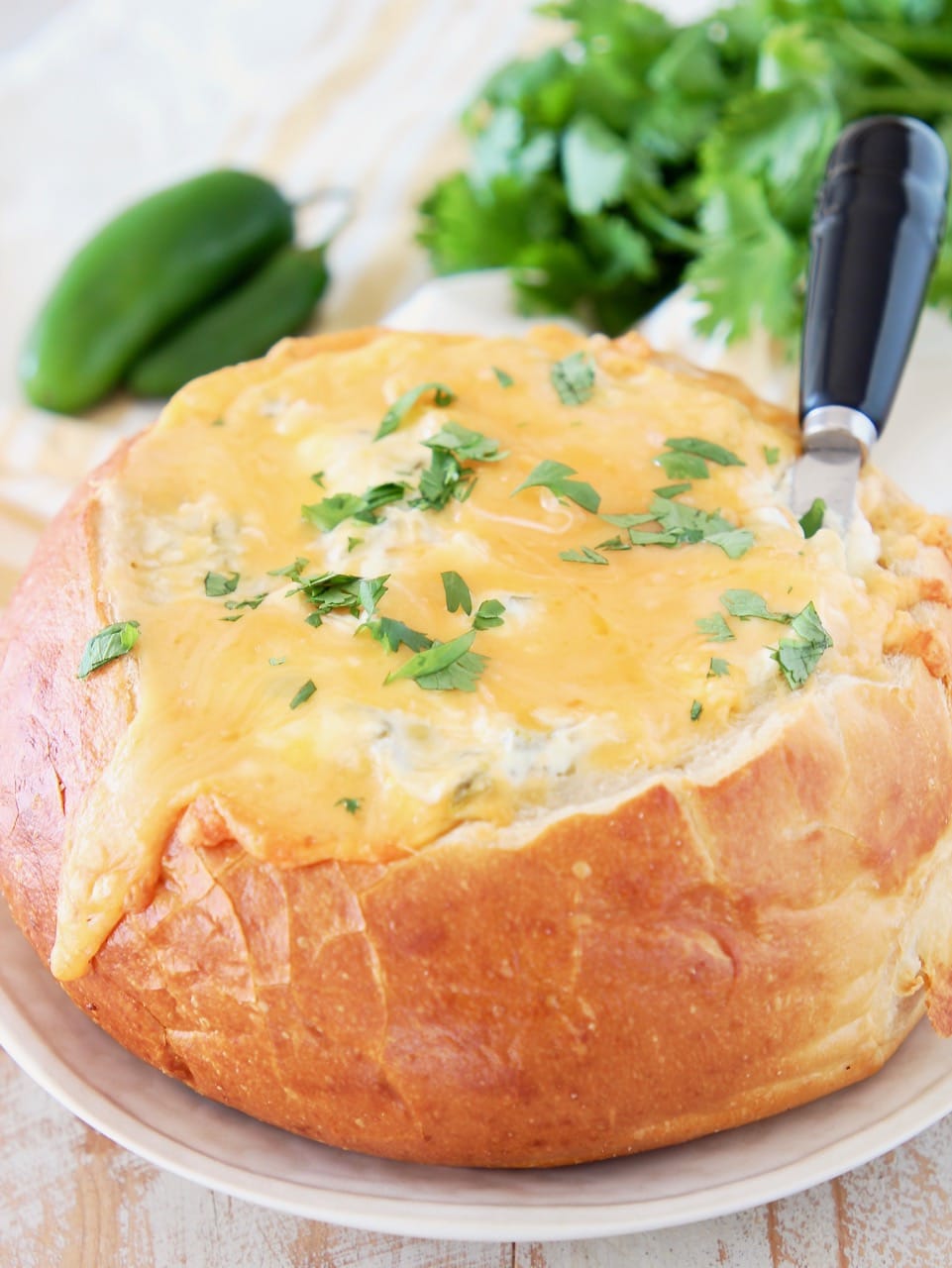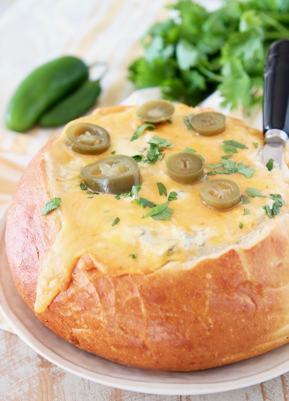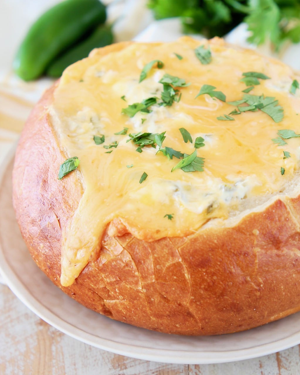 Cheesy sourdough bread bowl with fresh jalapenos and cilantro