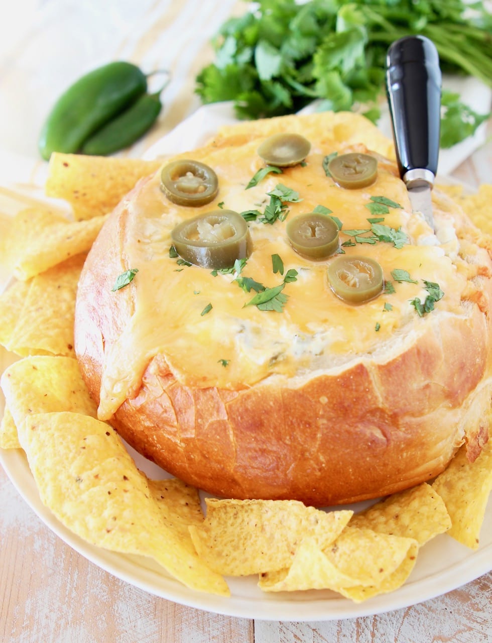 Jalapeno Popper Sourdough Bread Bowl with cheese spreader, fresh jalapenos and cilantro