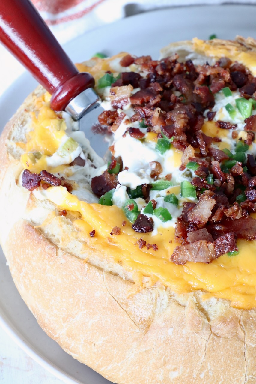 - Cut slits every inch along the edge of the bread bowl, for easy pulling apart and dipping.