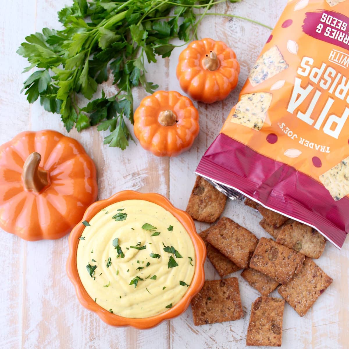 I served the dip with both Sweet Potato Chips and the Cranberry Pumpkin Seed Pita Chips from Trader Joe’s you see pictured in the images.