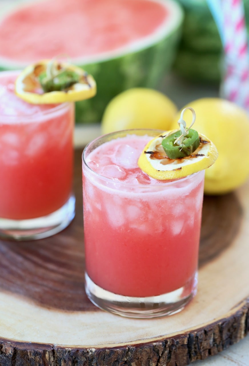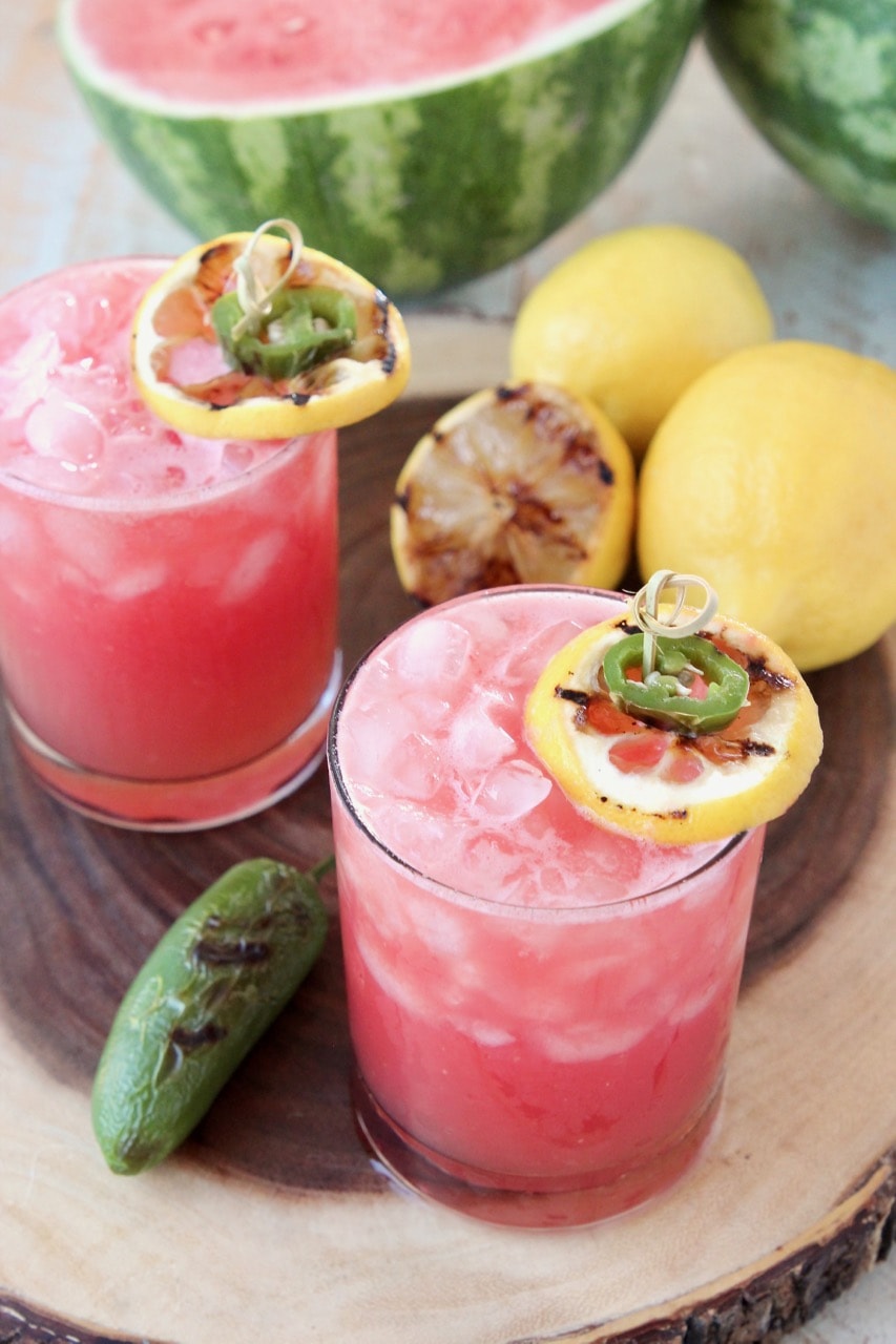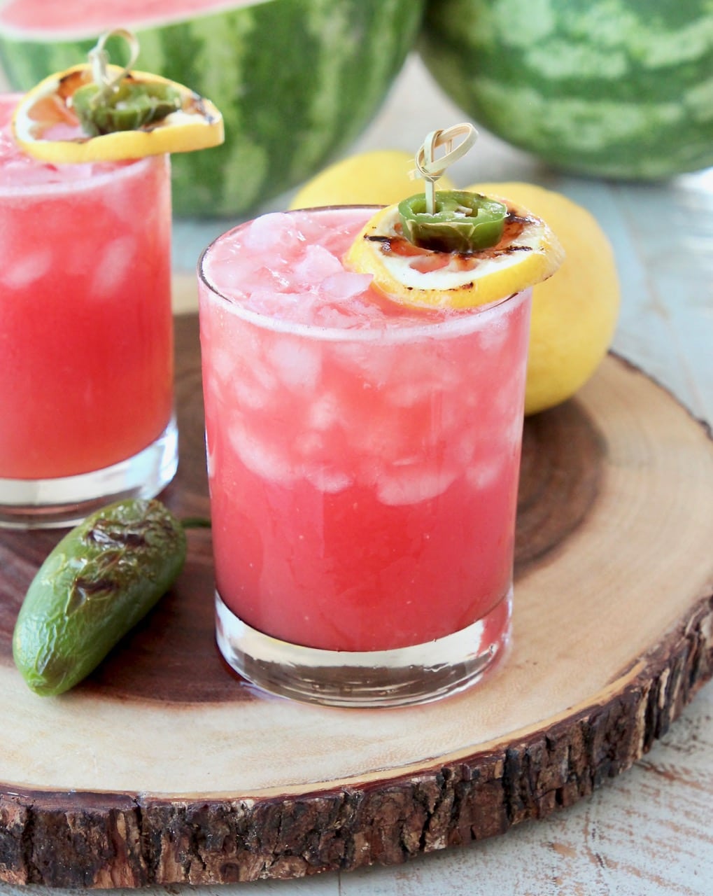 - Divide the blended watermelon juice between two glasses filled with ice. Add ½ oz lemon juice, 1 ½ oz tequila and 1 oz grilled jalapeno simple syrup to each glass.