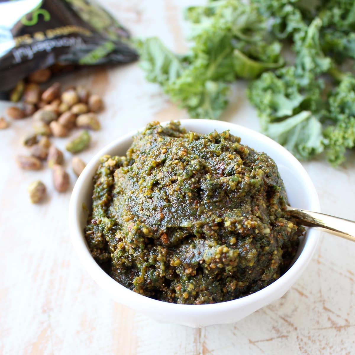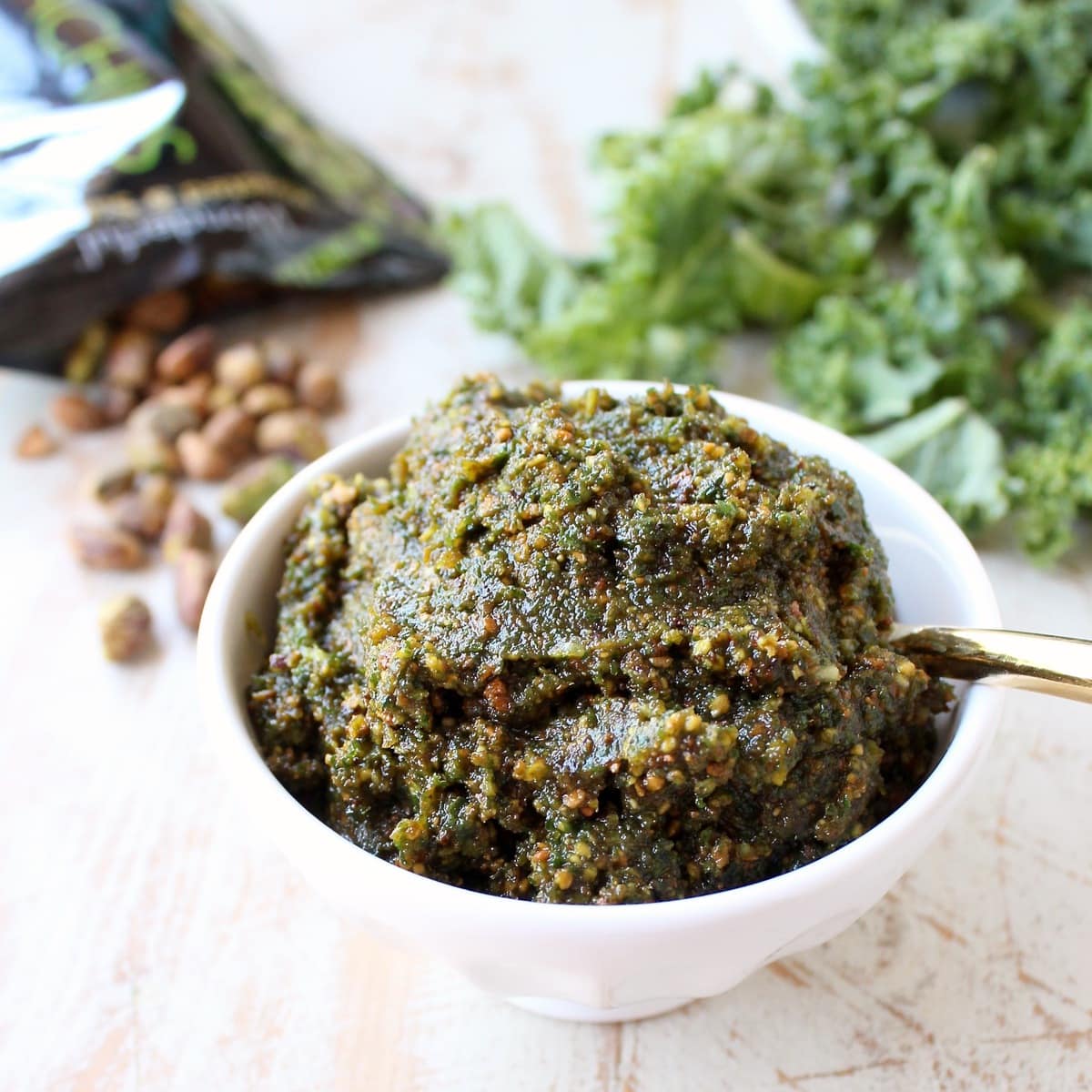 Fresh kale, pistachios and coconut oil are combined in this vegan and gluten free pistachio pesto recipe. It’s perfect with pasta, chicken or on pizza!