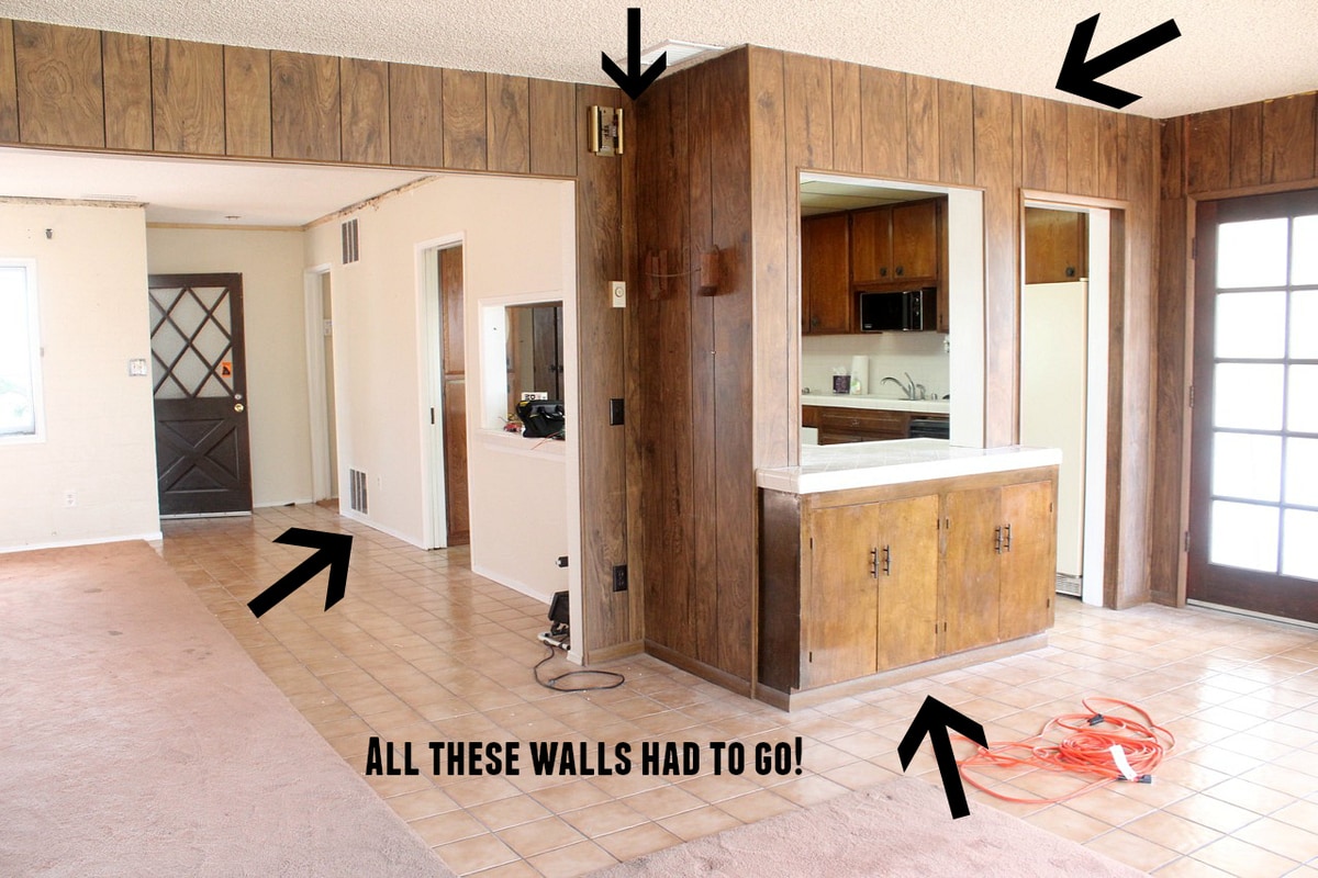 And all those walls blocking off the kitchen had to go. Only problem, the wall covered in wood paneling, yeah that was the original end of the house before it was added on to in 1976, so guess what, it was load bearing!