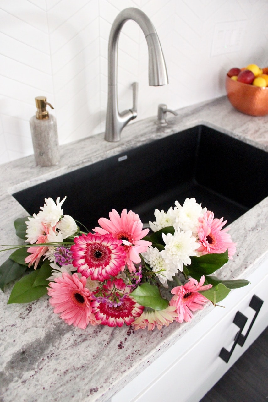 For the sink, I wanted a large, deep sink, so I went with a Blanco Super Single Bowl Sink, the color is called anthracite and it’s made of 80% solid granite. The sink is easy to keep clean and super deep, which I love!