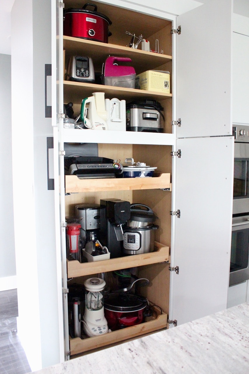 Totally obsessed with my appliance pantry! Since I own 14 crock pots, an Instant pot, 2 food processors, a meat grinder, sausage maker, 3 juicers, 2 coffee makers, a toaster, soda stream, indoor grill… and the list goes on… an appliance pantry was VERY NECESSARY!