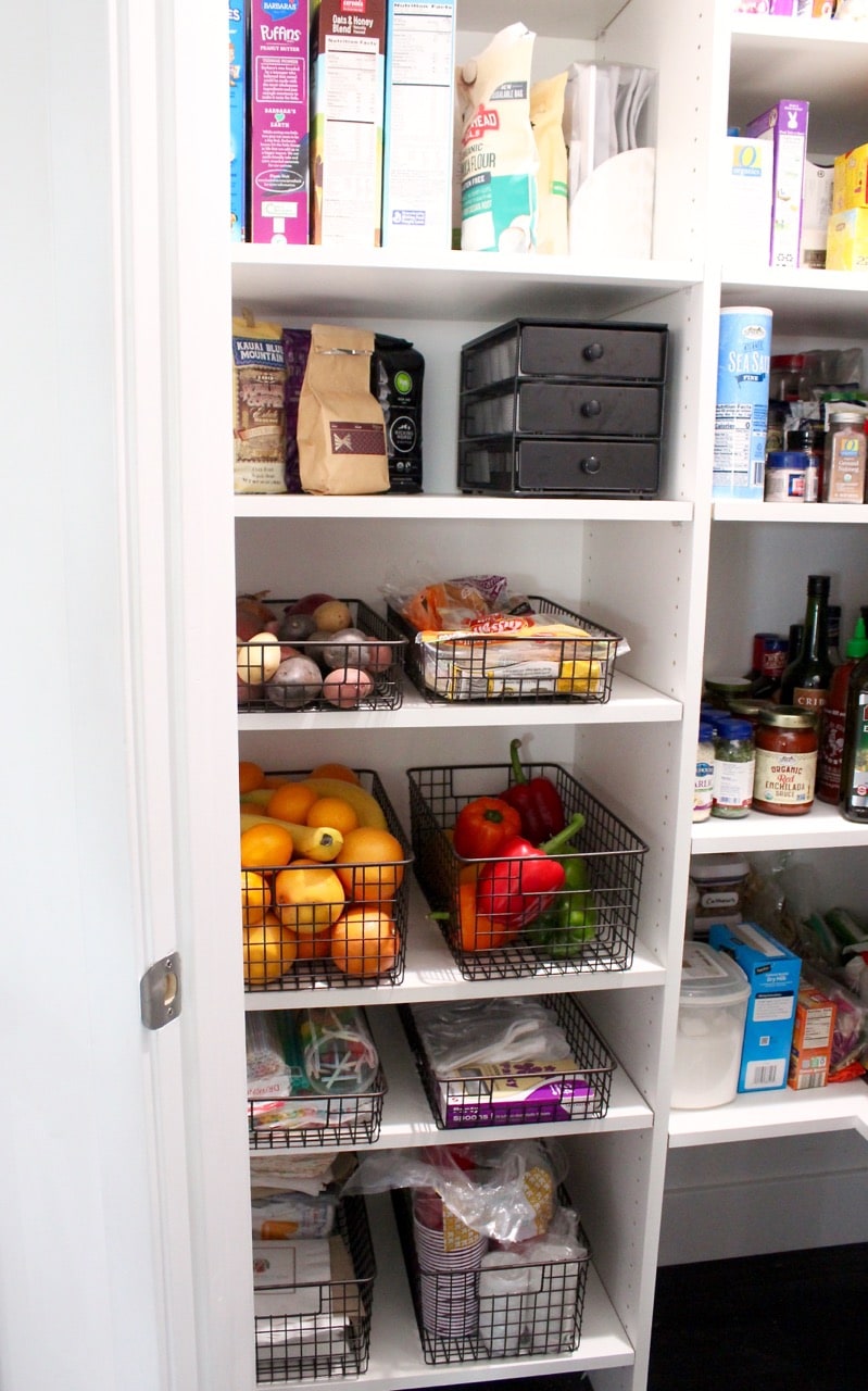 To organize my corner food pantry, I used deep wire baskets for fruit, veggies, plastic cups and paper napkins and shallow wire baskets for tortillas and bread, plastic silverware and straws. I also added a 3-drawer K-cup organizer, which holds 54 K-cups for my morning coffee!